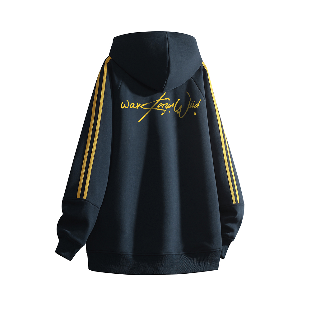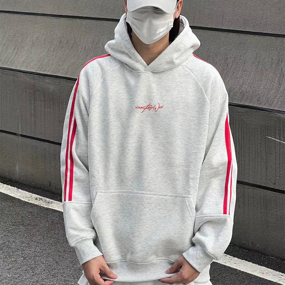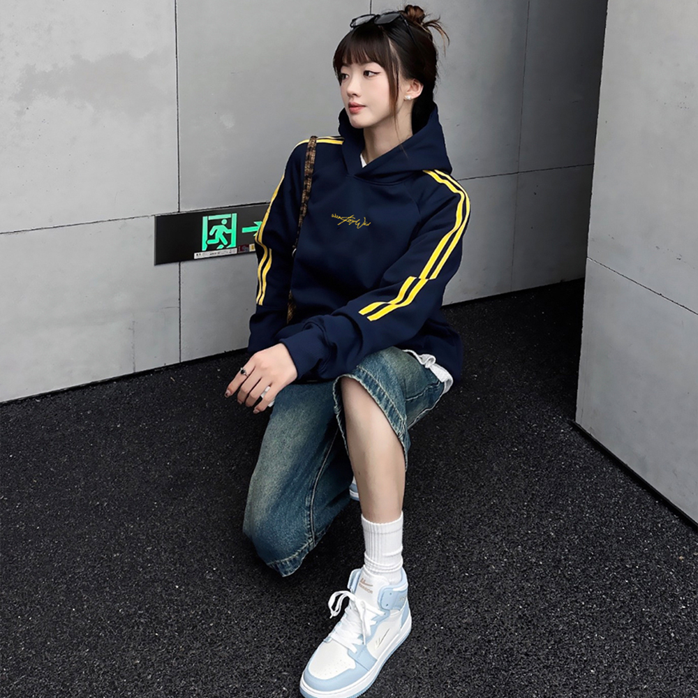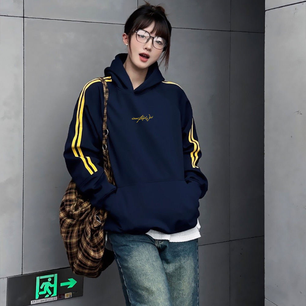 XDFM美式简约运动撞色条纹字母印花加绒加厚连帽卫衣男女同款宽松