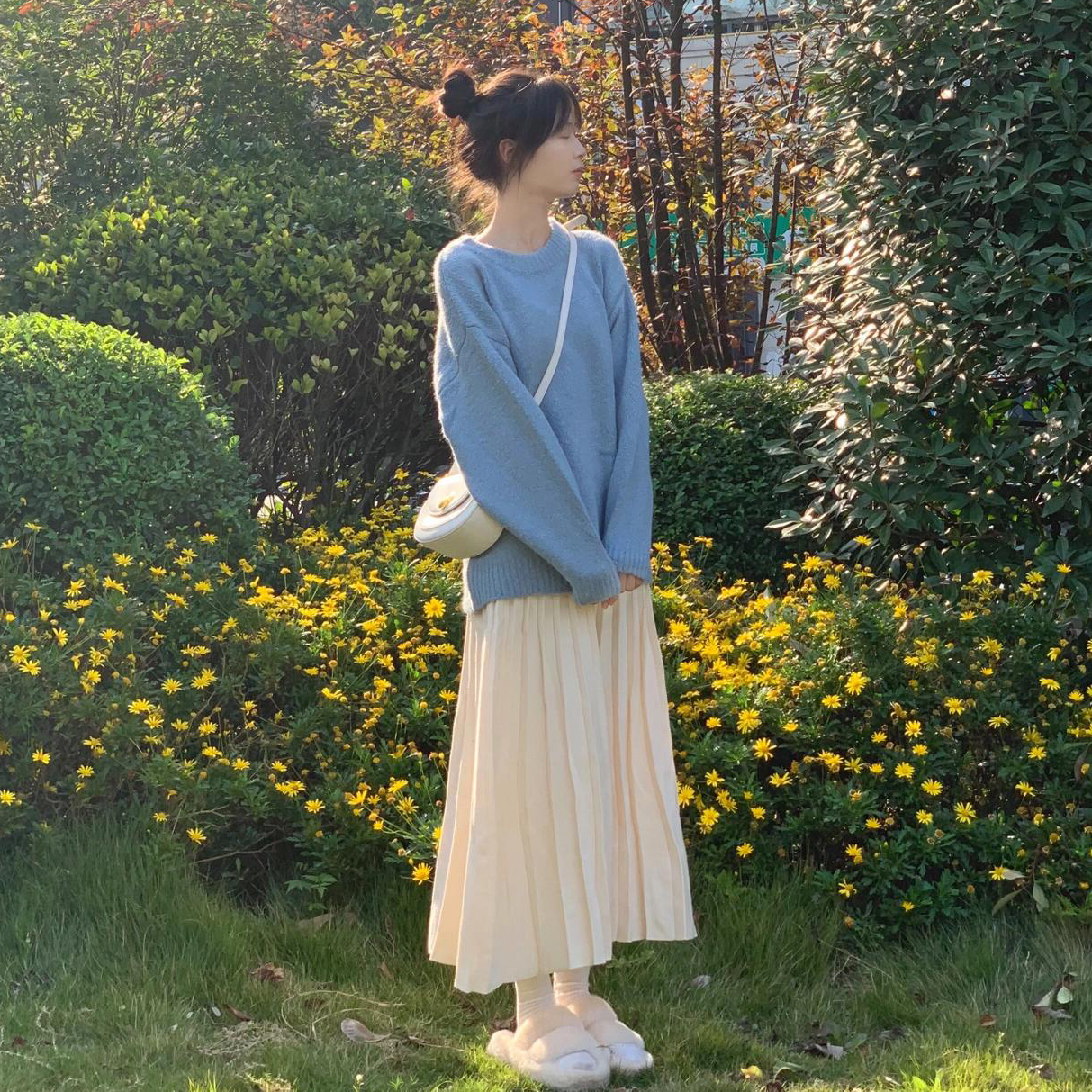 孕妇连衣裙套装秋冬2025新款蓝色宽松休闲针织毛衣半身裙两件套女