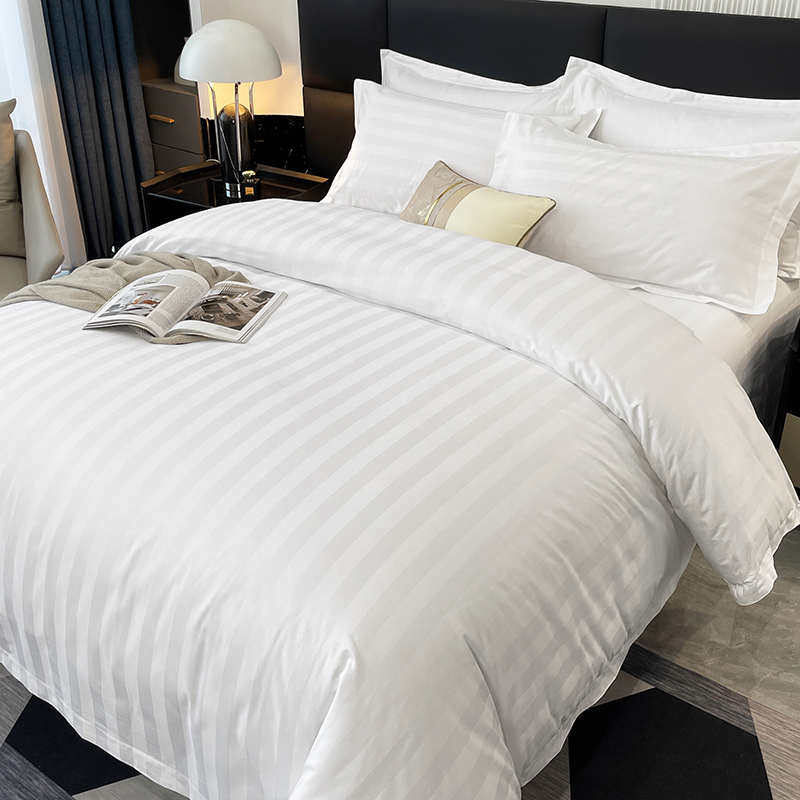 酒店缎条四件套含被芯枕芯纯白色床单被套三件套宾馆民宿床上用品