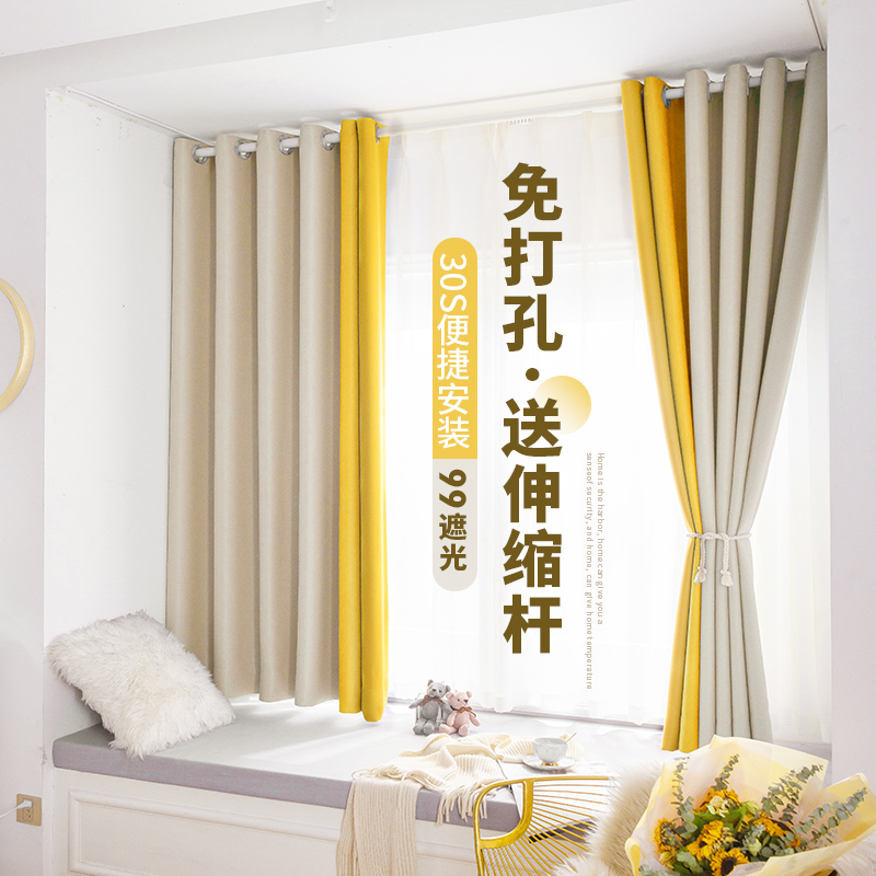 窗帘免打孔简易安装伸缩杆一整套卧室遮光2022新款遮挡帘飘窗短布