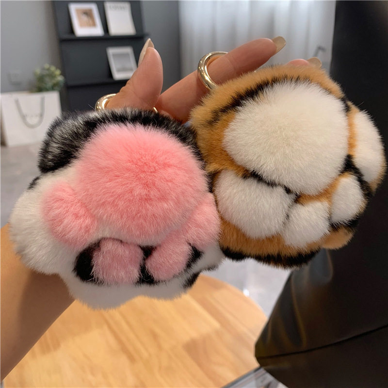 海宁进口真獭兔毛豹纹小猫爪汽车钥匙扣挂件可爱毛绒球书包包挂饰