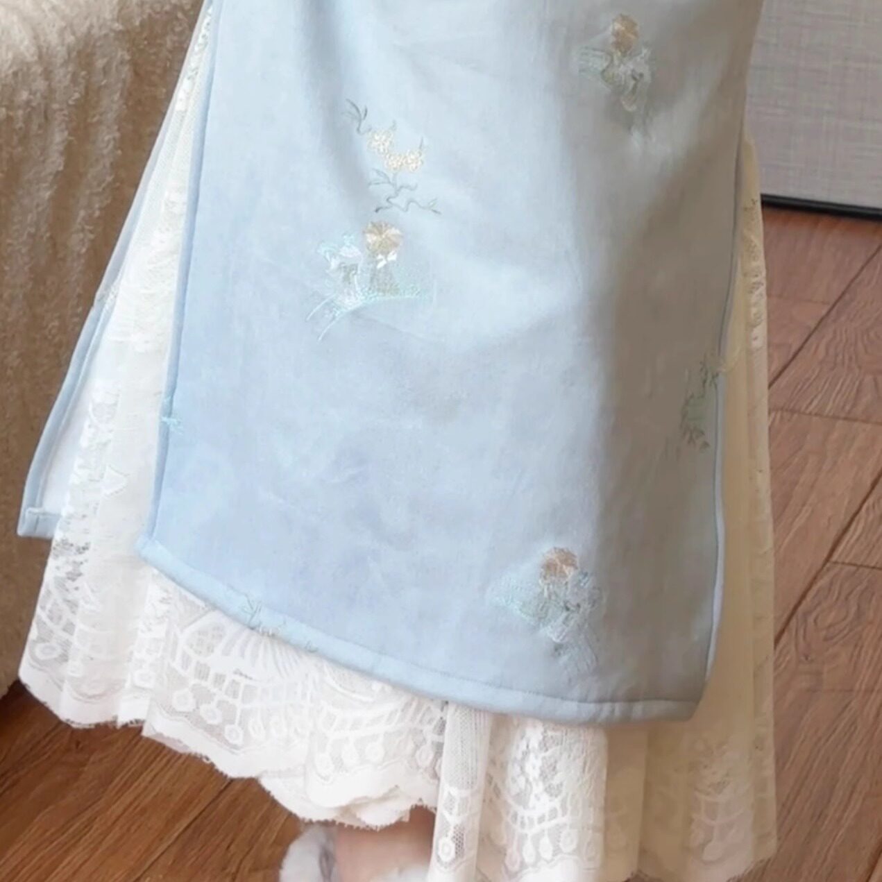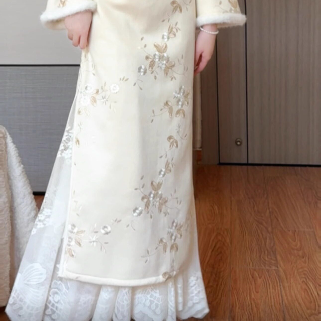 抹茶麻薯2026年冬季新款旗袍衬裙加绒打底内搭蕾丝纯色大摆半身裙
