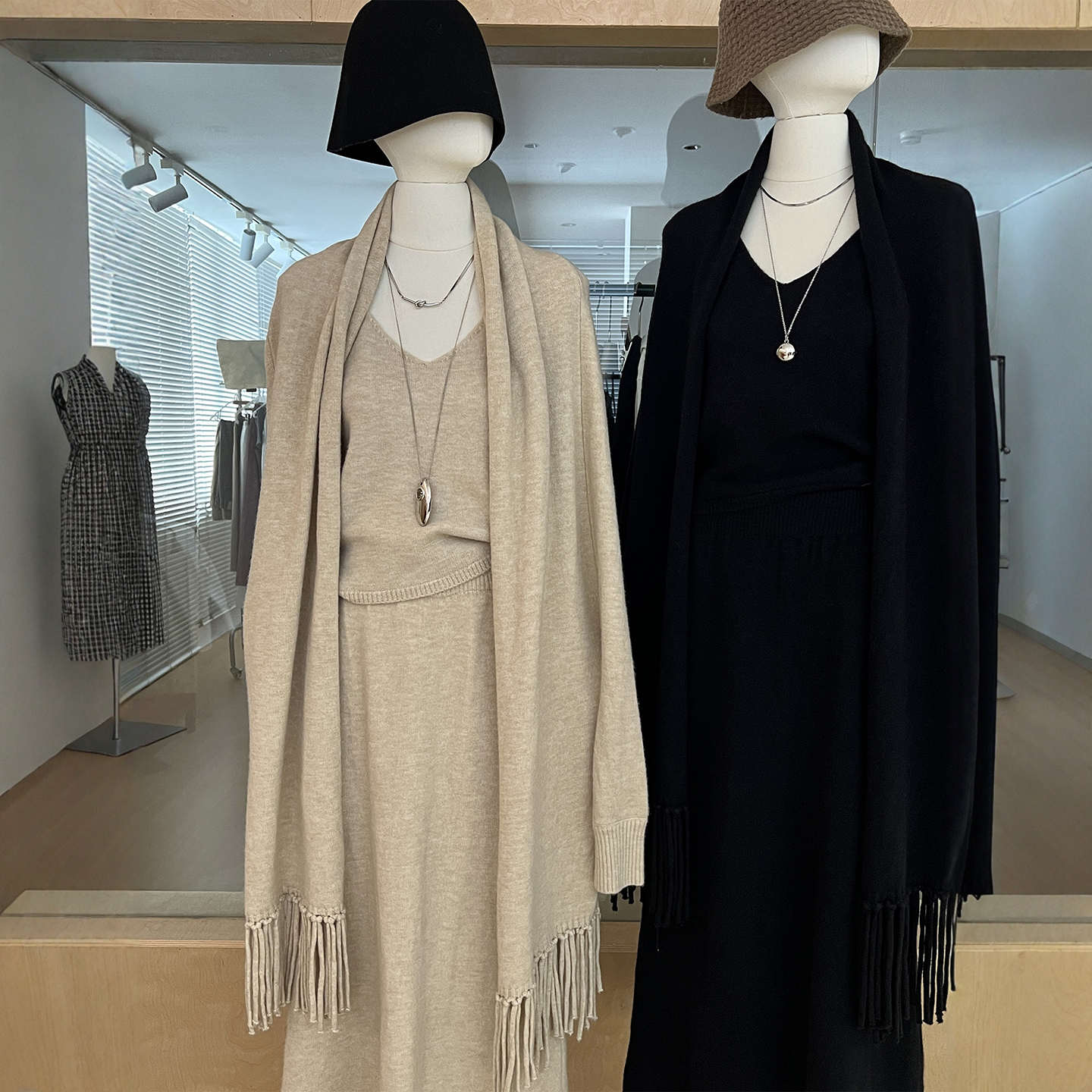 巨好看的针织套装一整套穿搭女秋流苏开衫+背心+半身裙毛衣三件套