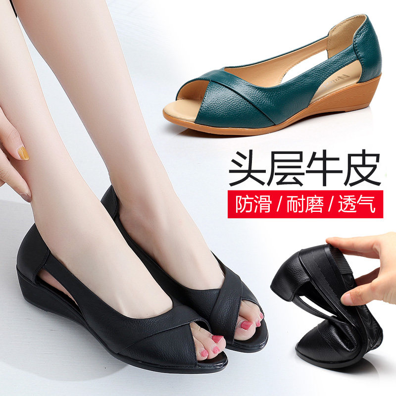2025春夏女凉鞋真皮女鞋坡跟中跟中年妈妈鞋特大码鱼嘴防滑皮凉鞋