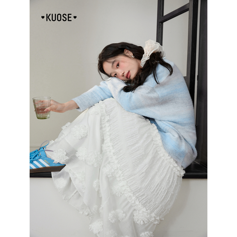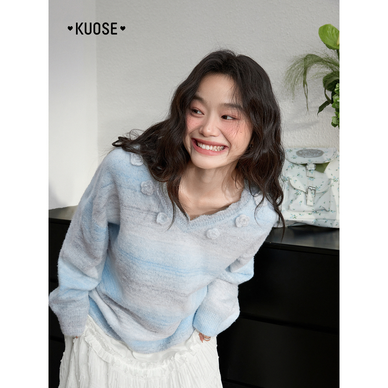 阔色渐变条纹毛衣蓝色v领针织衫2025秋冬季新款女装宽松气质上衣