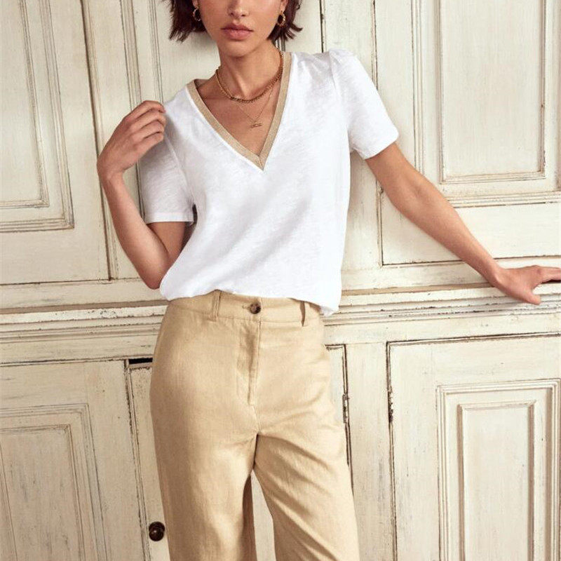 英国bd原单尾货 夏季官网新舒适竹节棉鸡心领镶边女短袖深V领T恤