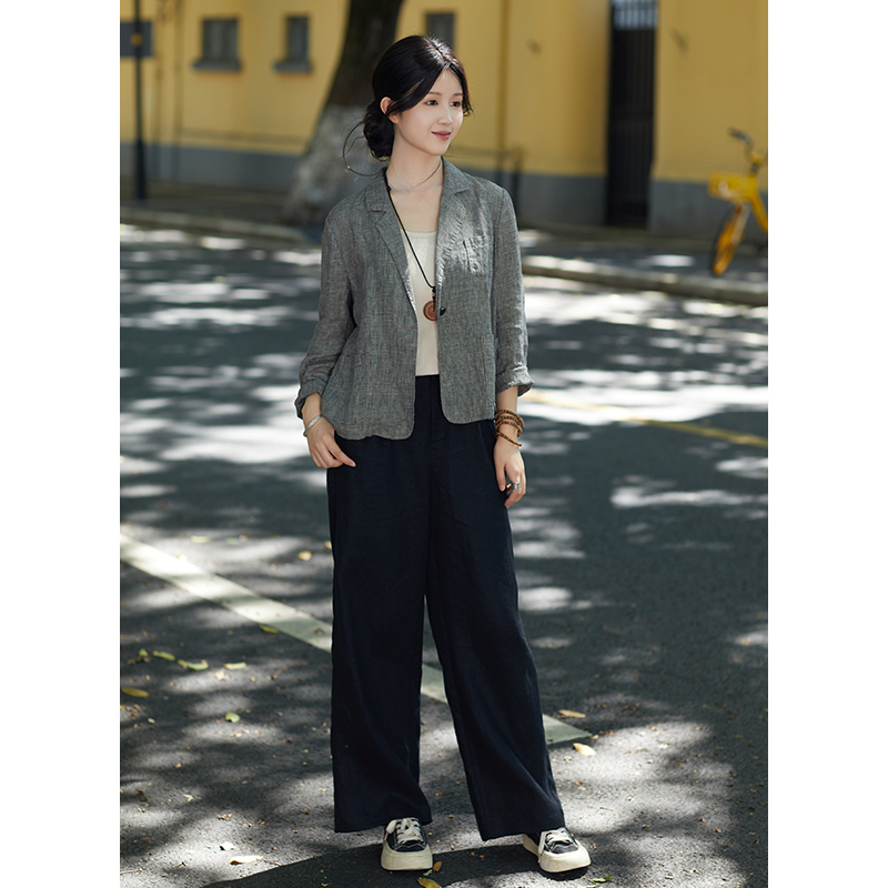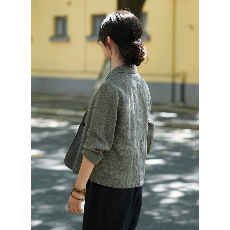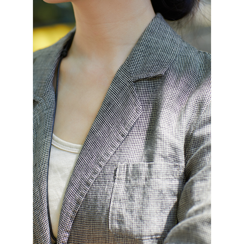 忘城A1025座/像飞鸟一样/秋色织亚麻千鸟格休闲文艺复古西装外套