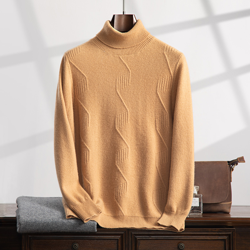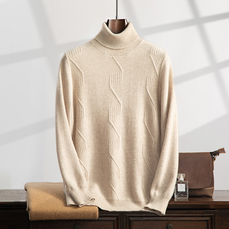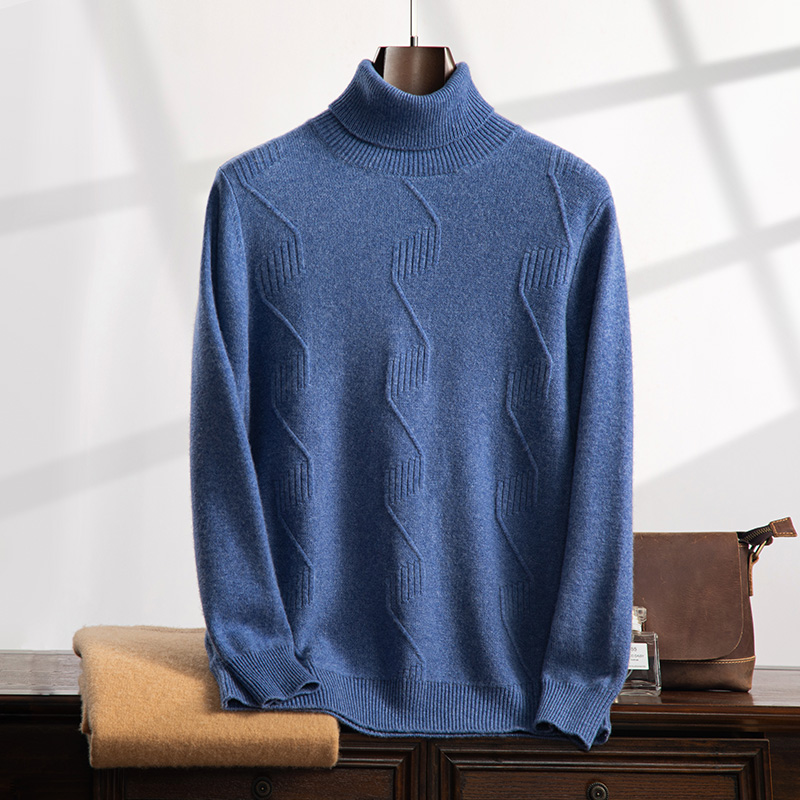 秋冬新款男士高翻领针织山羊绒衫纯色加厚扭花宽松打底羊绒毛衣