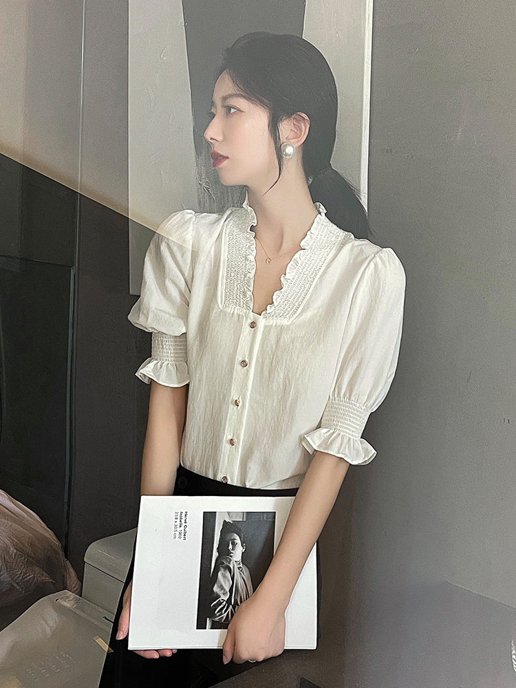 夏季高级感法式上衣女复古短袖薄款设计感小众方领泡泡袖雪纺衬衫