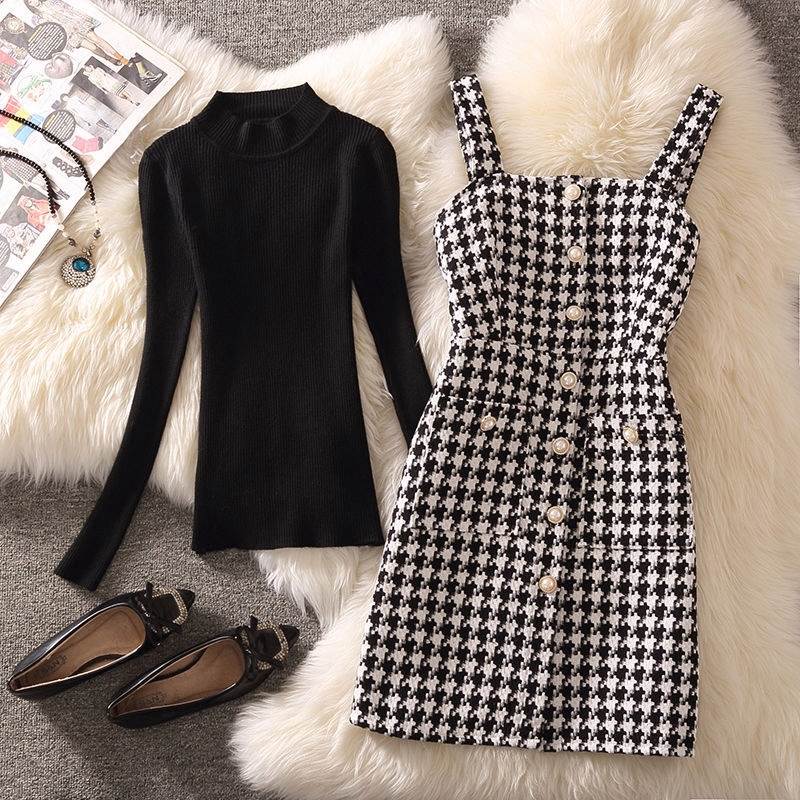 2025年长袖气质女秋冬背带裙新款吊带连衣裙格子显瘦毛呢收腰打底