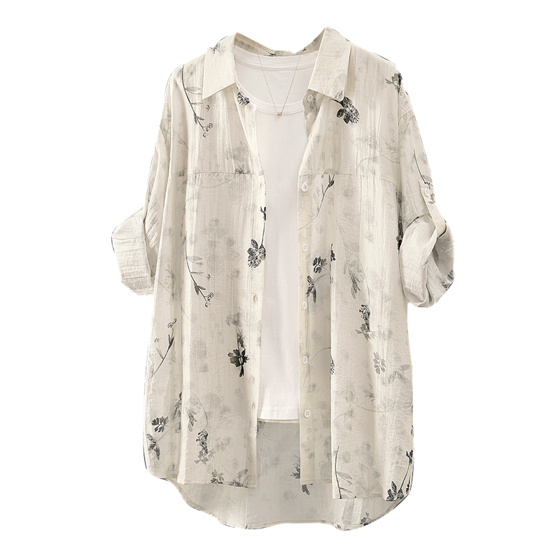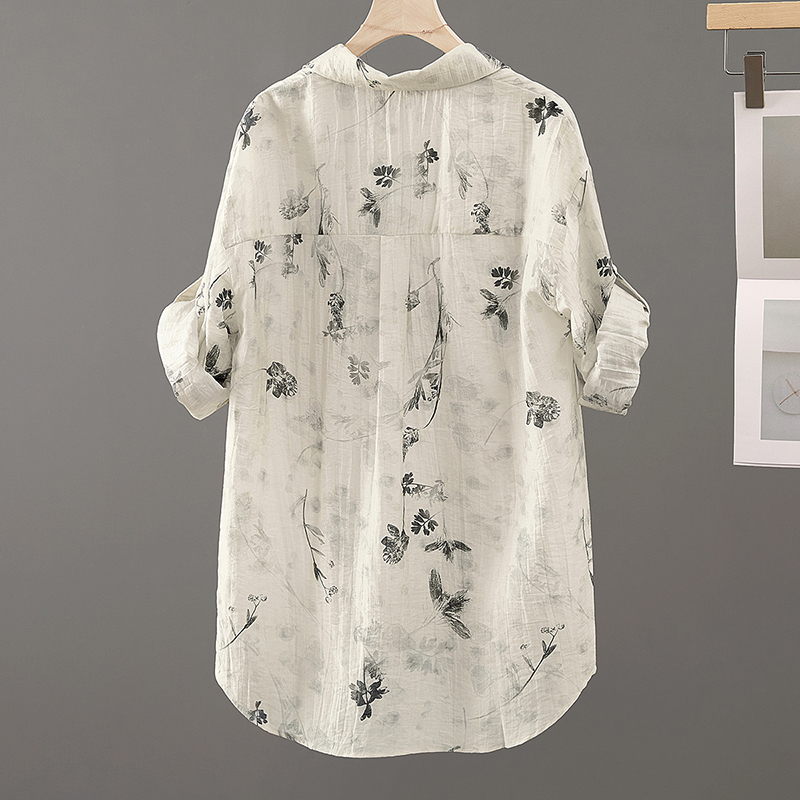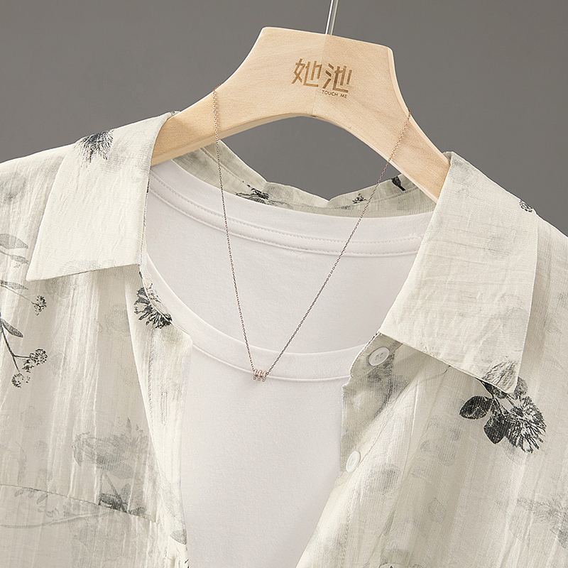 她池中长款衬衫2025秋装新款女装国风印花长袖宽松款单排扣上衣