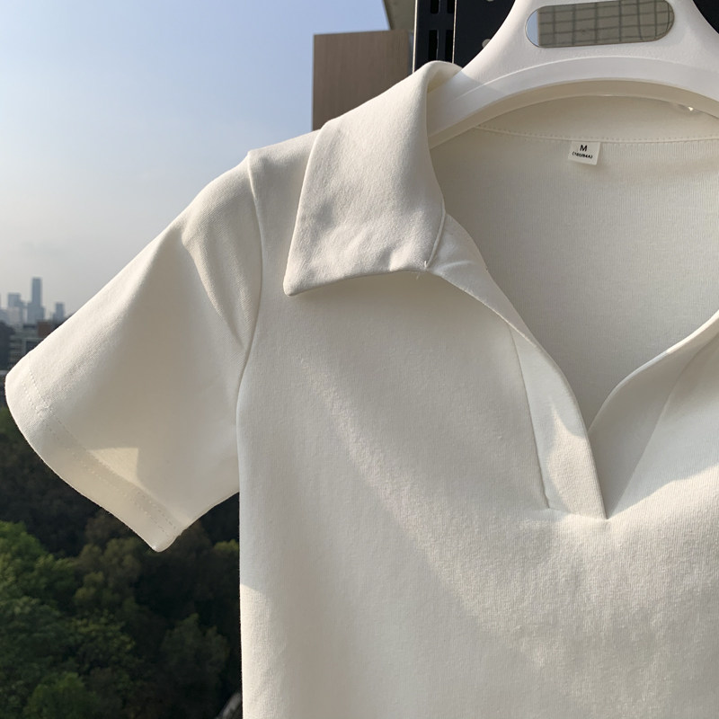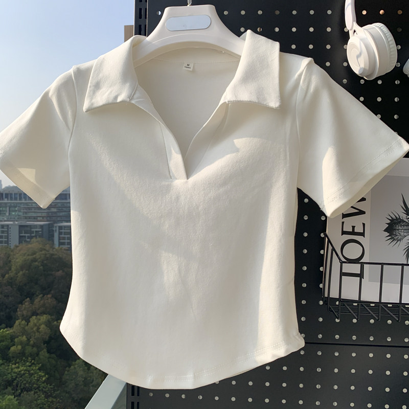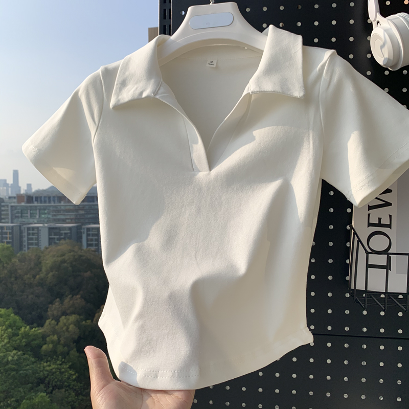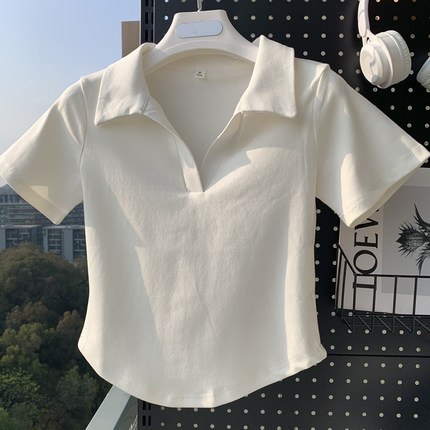 辣妹棉质正肩短袖T恤小v领短款露脐polo衫女夏季修身显瘦ins上衣