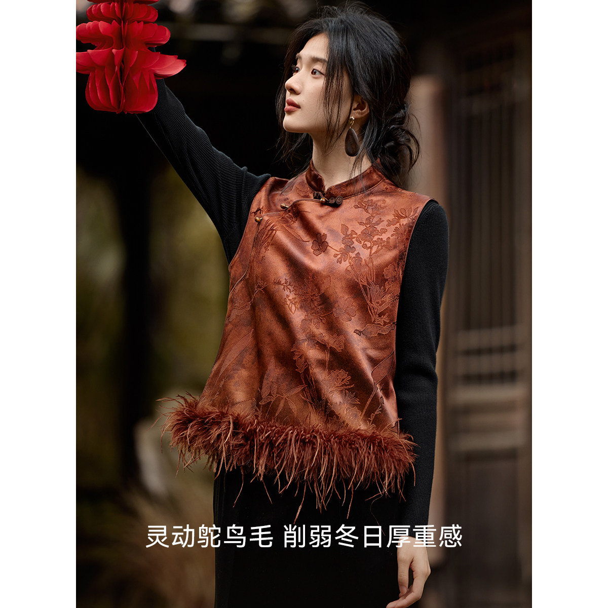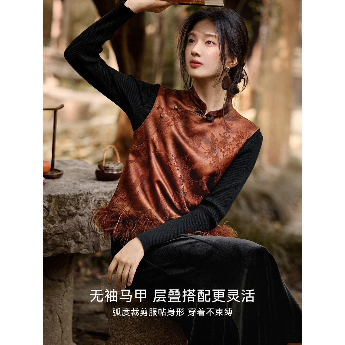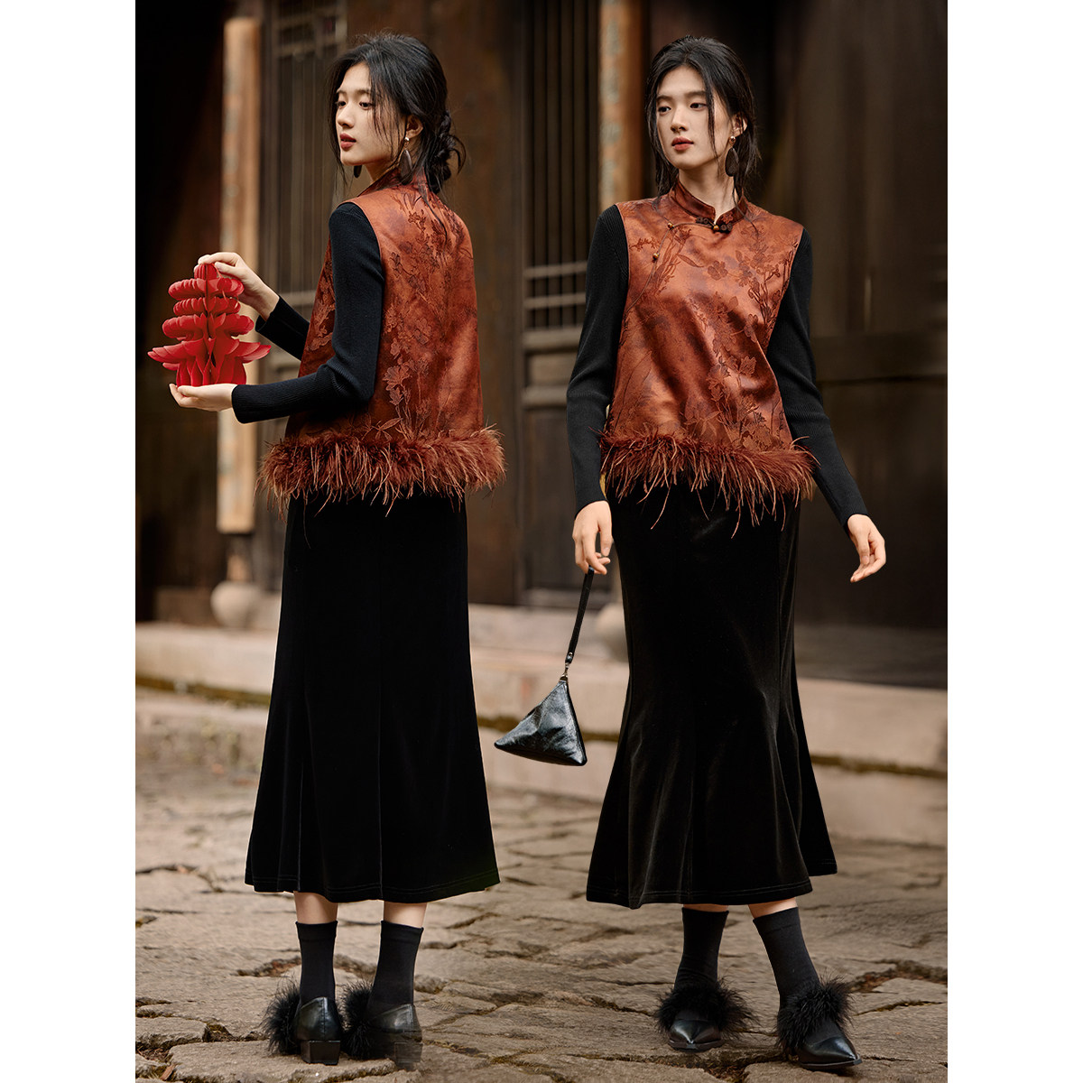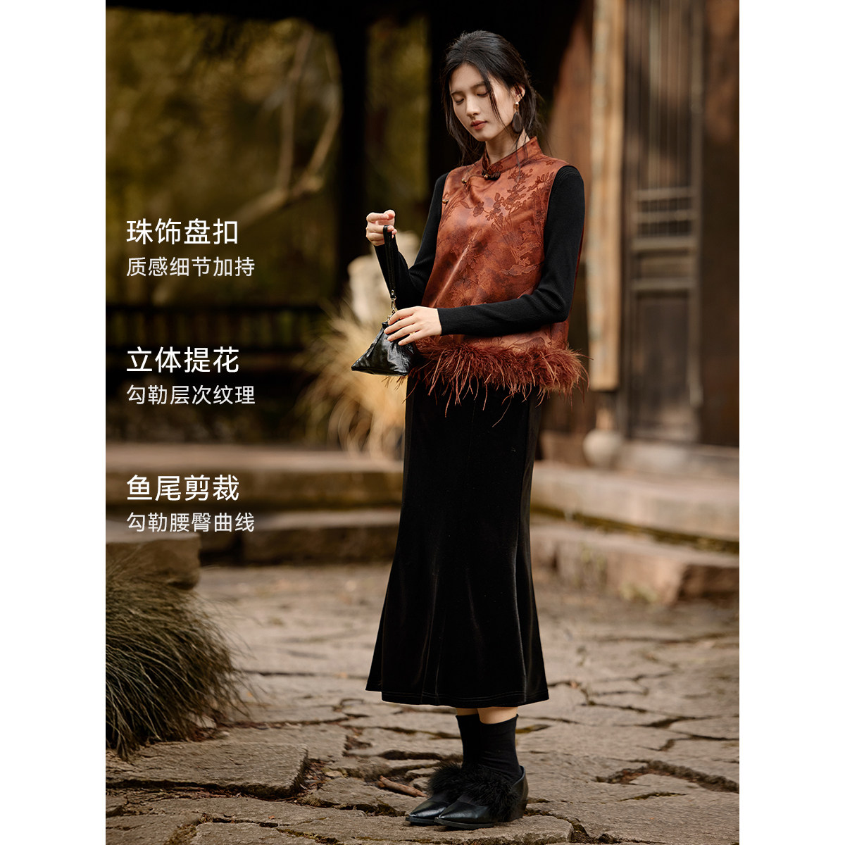 XWI欣未新中式羽毛拼接提花马甲套装女优雅丝绒鱼尾半裙两件套