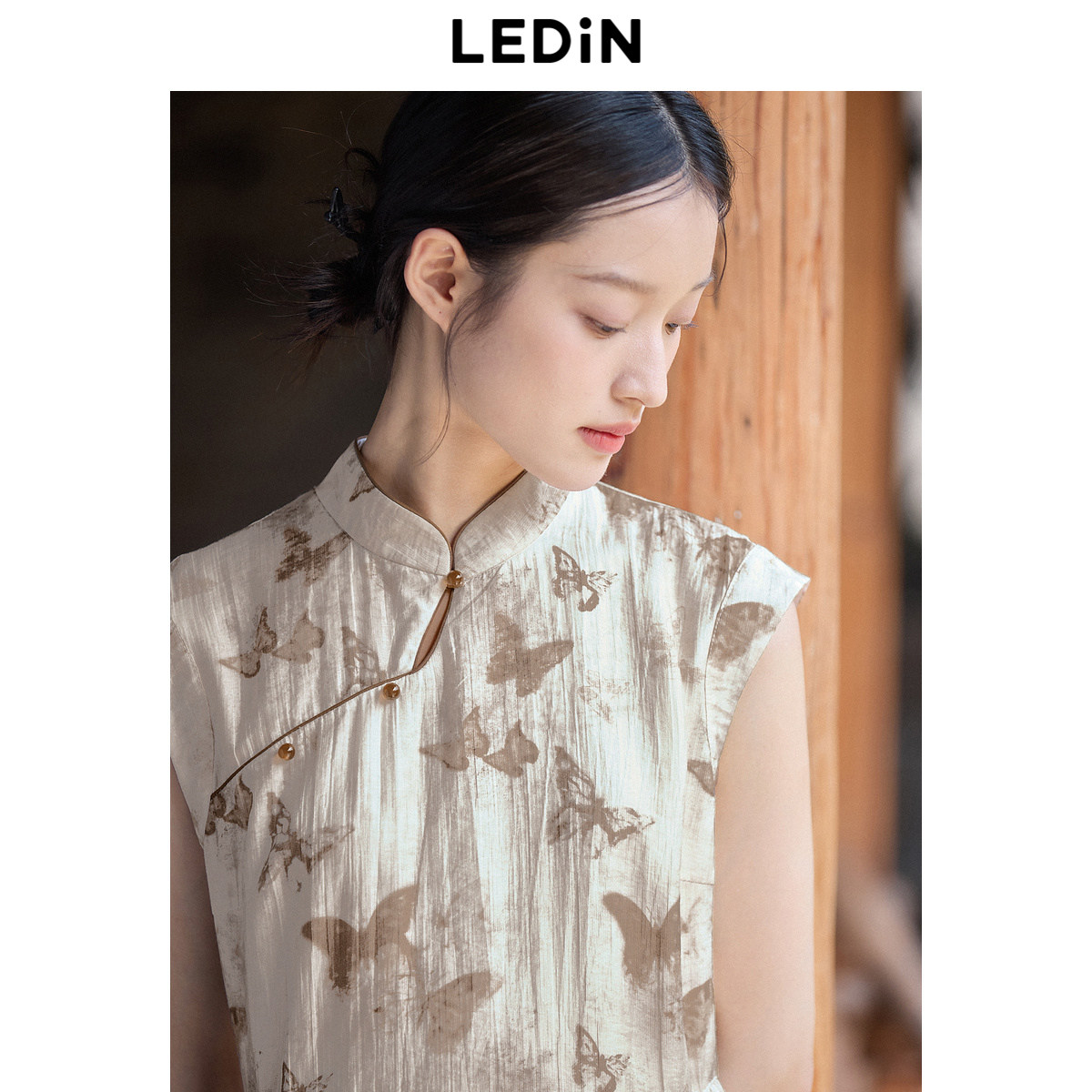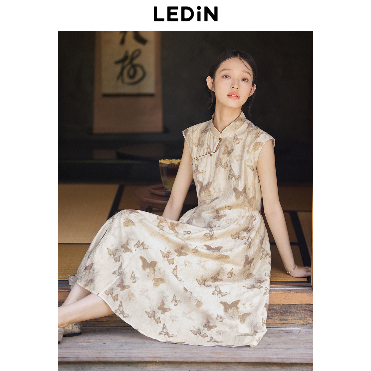 乐町改良新中式恋恋蝶影长裙夏季新款无袖连衣裙立领大裙摆国风裙