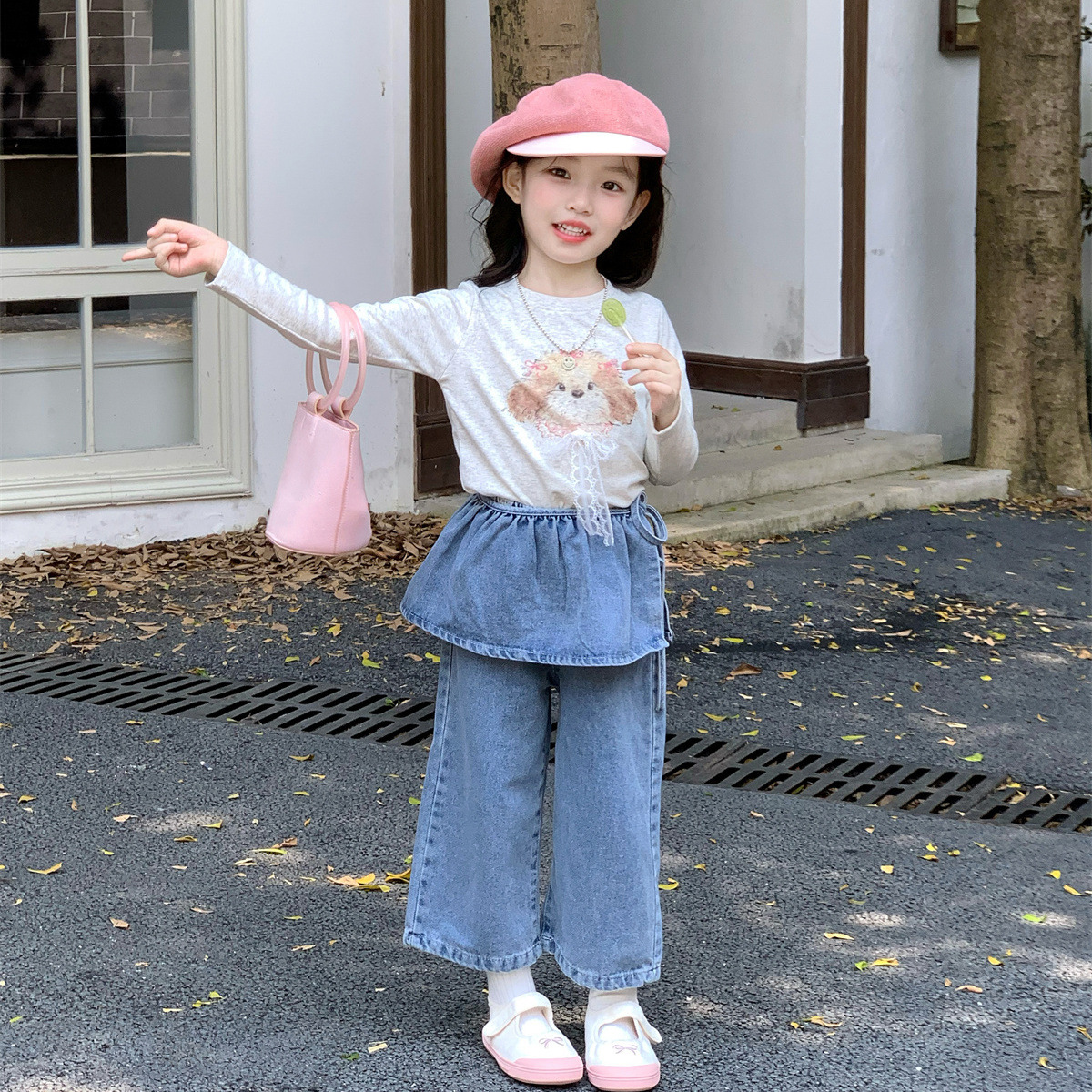 女童休闲套装2025秋季韩版宽松长袖蝴蝶结卫衣T恤百搭屁帘牛仔裤