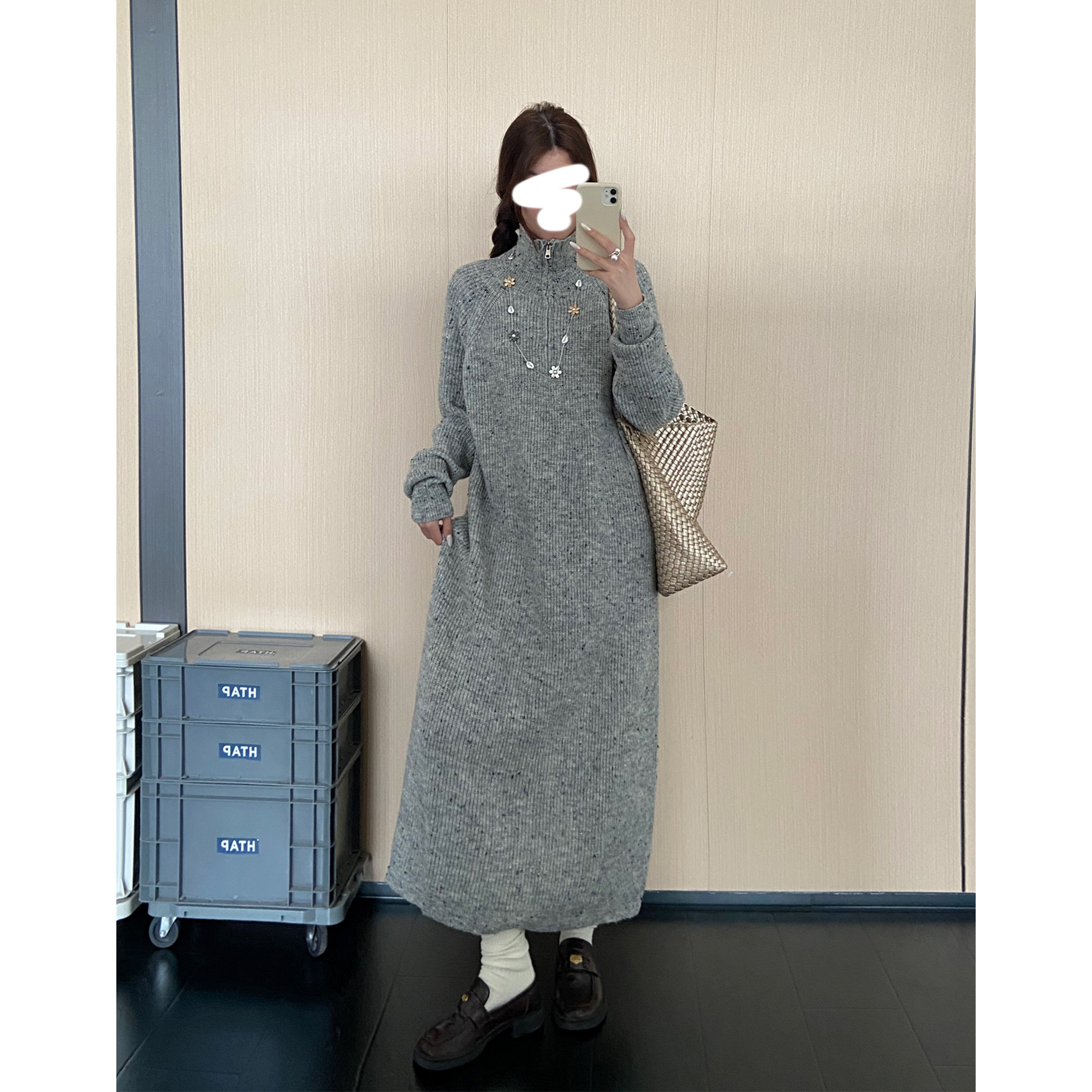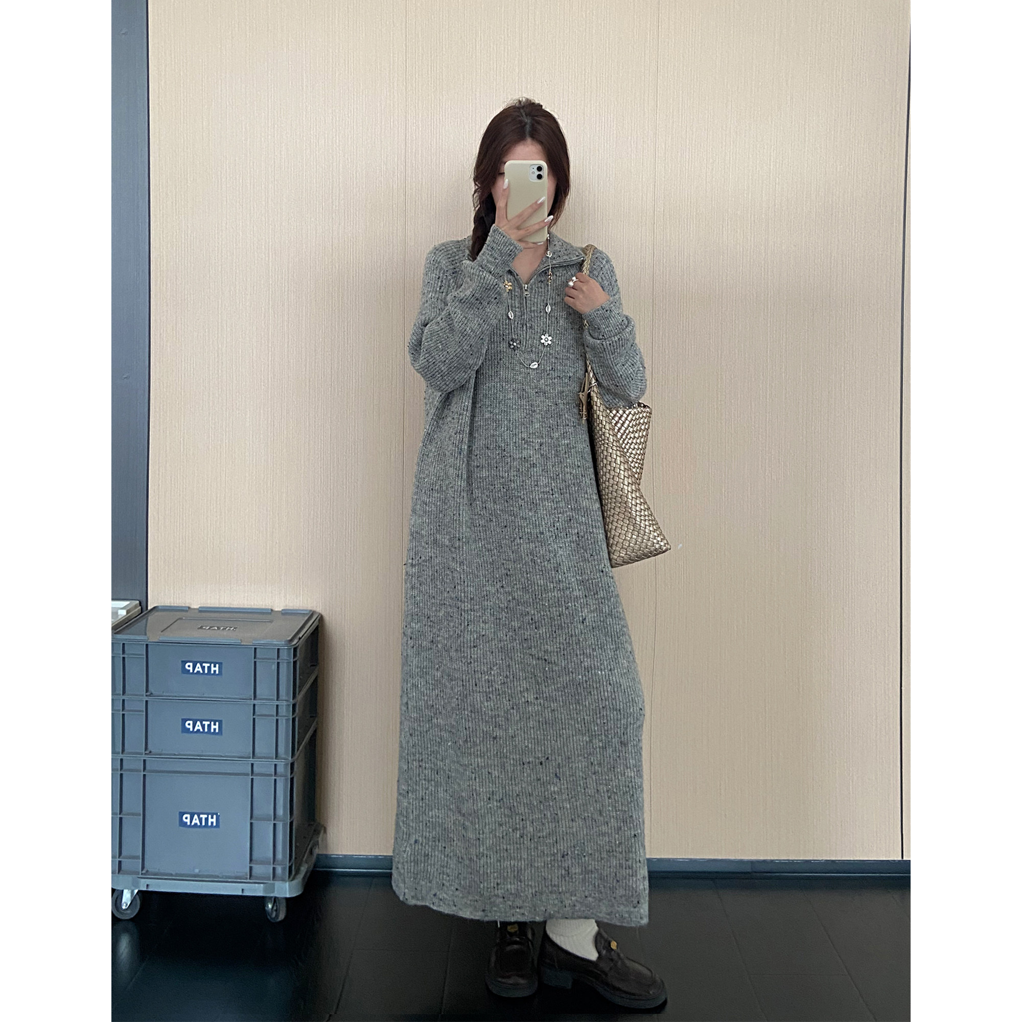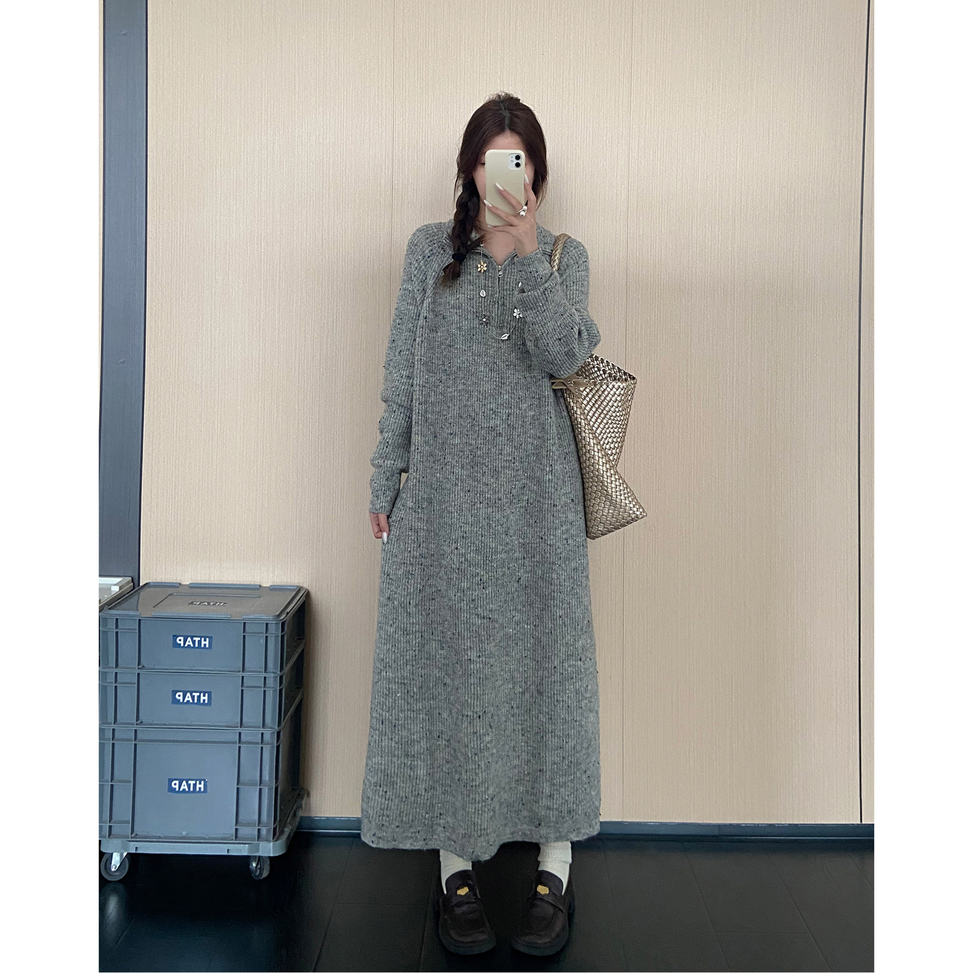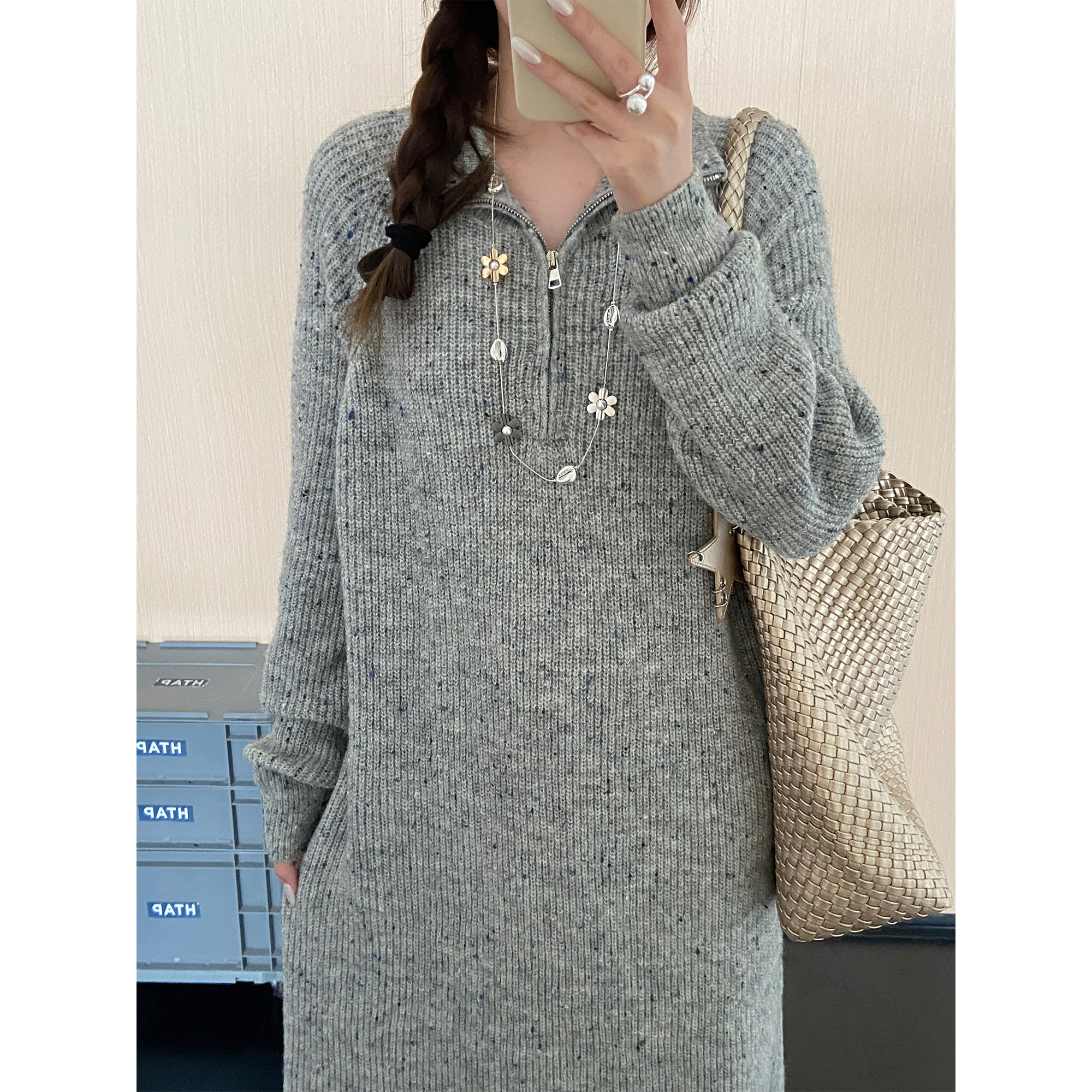 法式复古针织连衣裙女2025秋冬季新款灰色高领打底内搭宽松毛衣裙