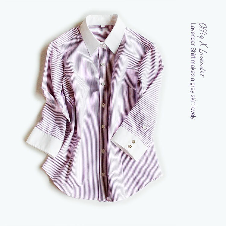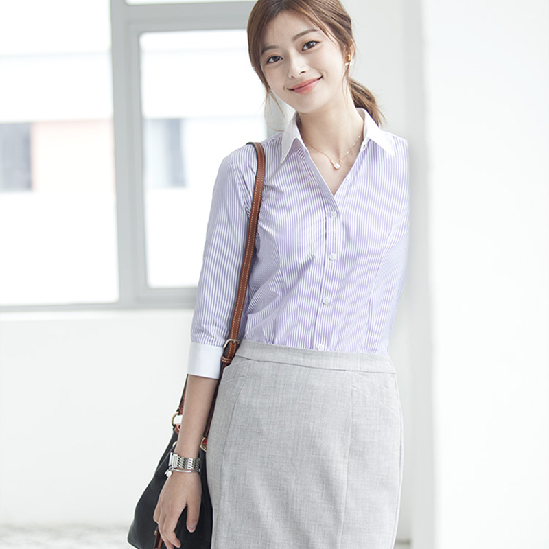 OFFIY-春夏银扣收腰修身简约正装面试职业中袖粉紫色条纹衬衫女