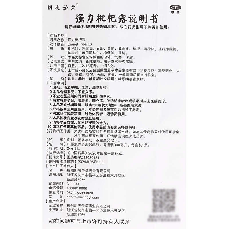 胡庆余堂 强力枇杷露 330ml枇杷膏咳嗽止咳祛痰支气管炎止咳化痰