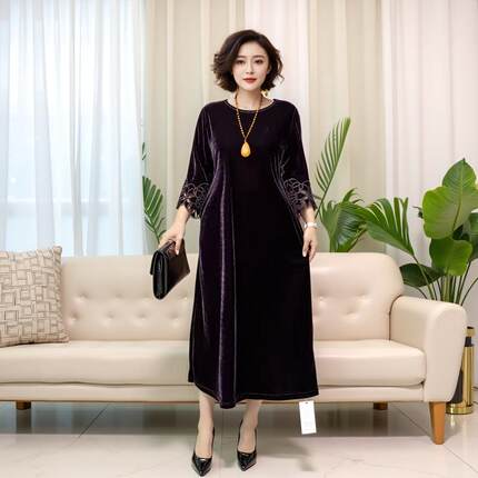 高档贵夫人真丝绒连衣裙2025年货春装新款坠感大码遮肚显瘦长裙女
