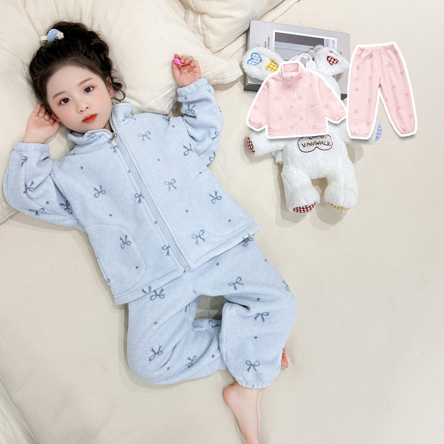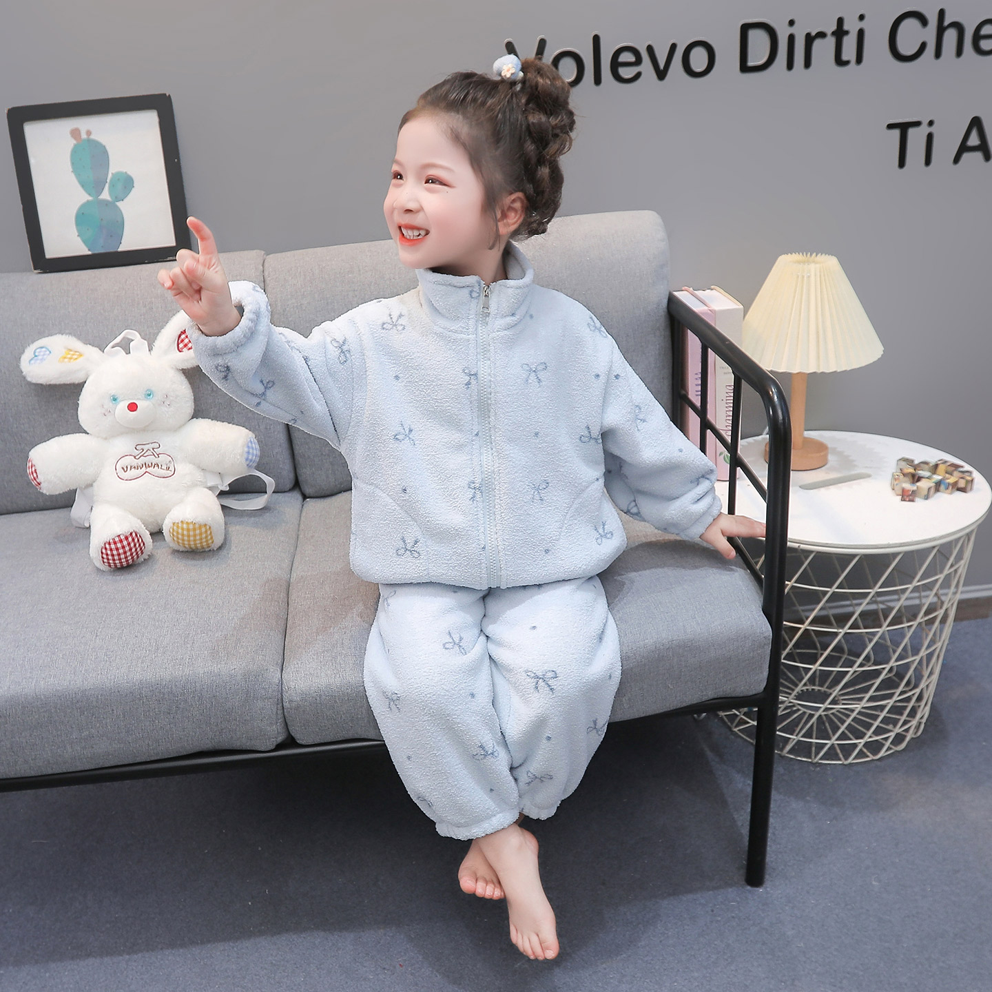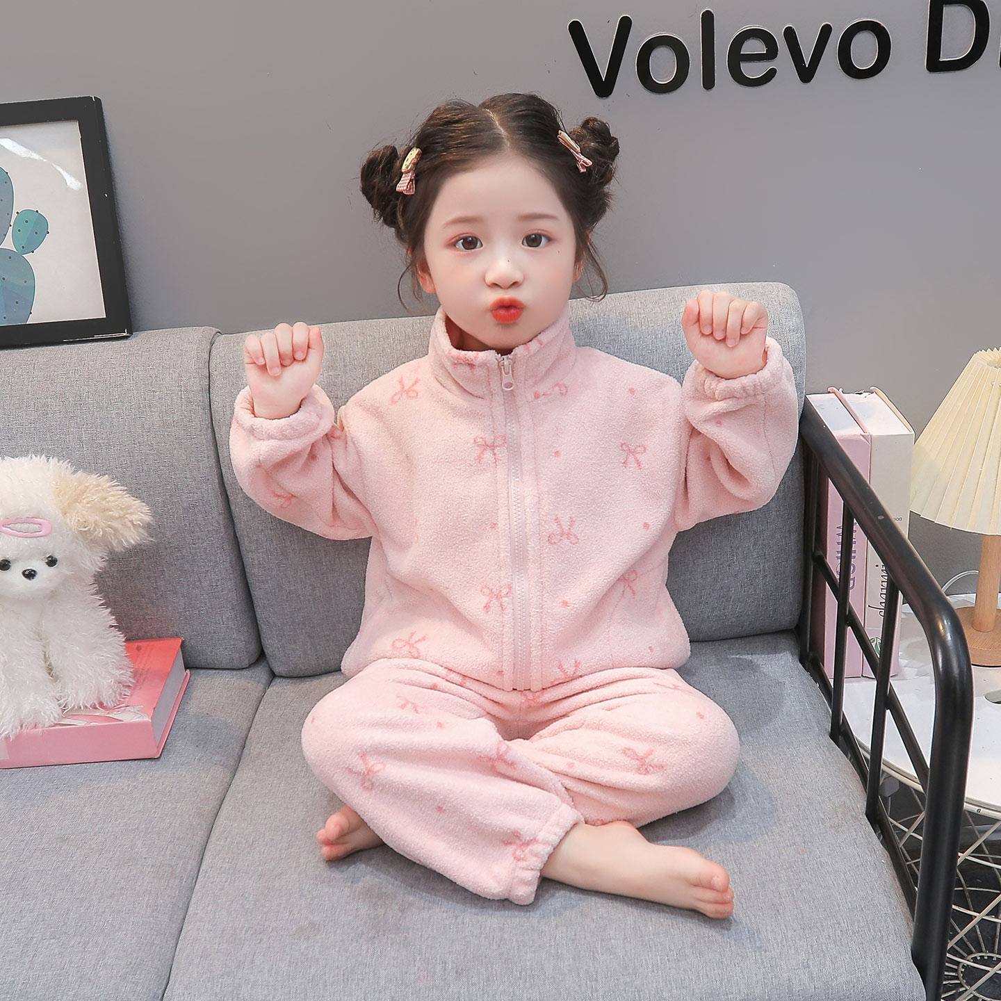 女童睡衣秋冬套装2025新款女孩宝宝冬款拉链立领儿童珊瑚绒家居服