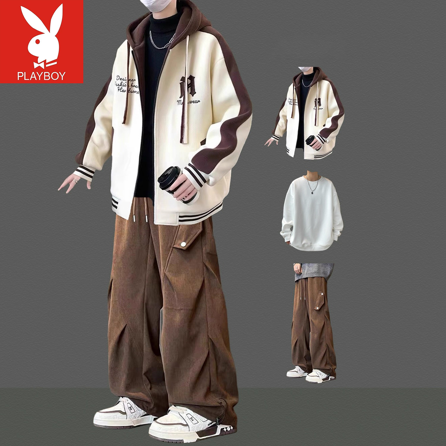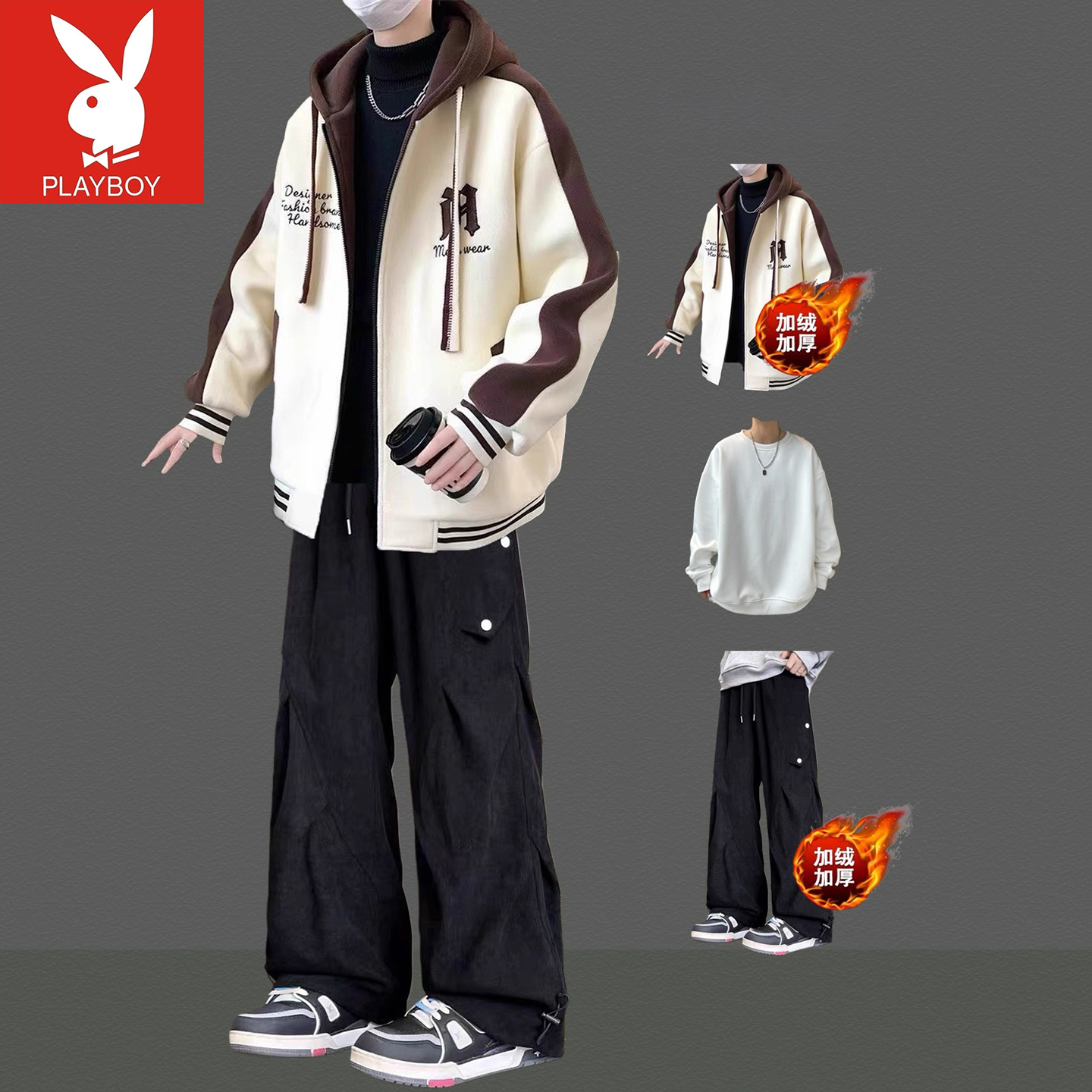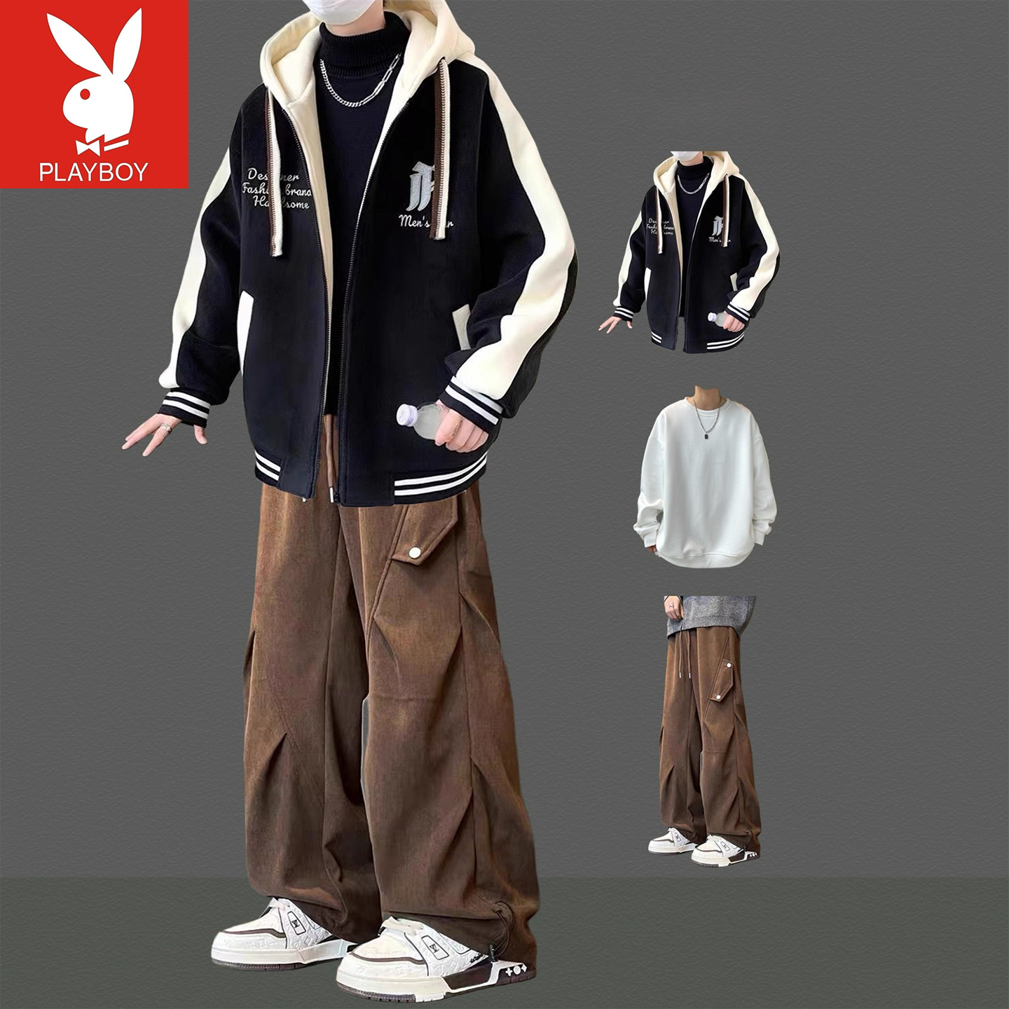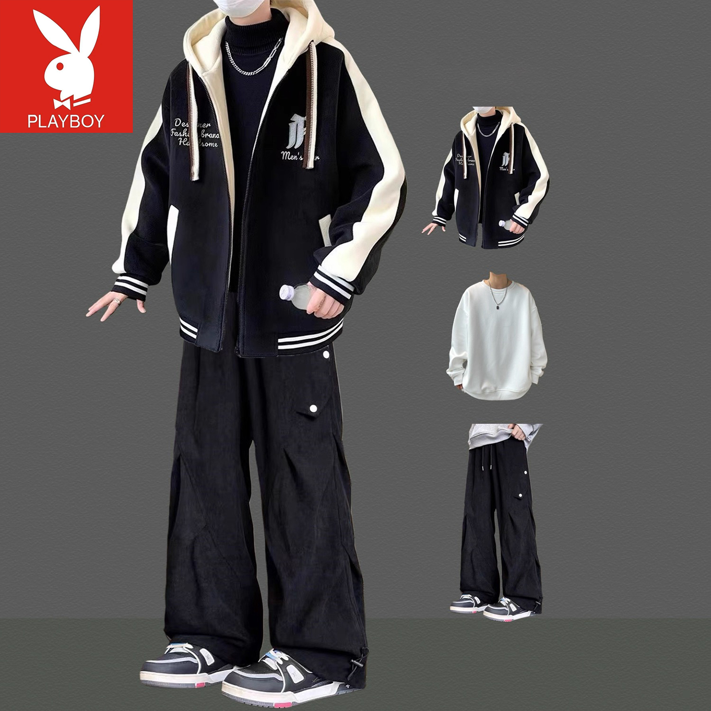 花花公子连帽开衫外套男生潮牌套装春秋棒球服夹克初高中生三件套