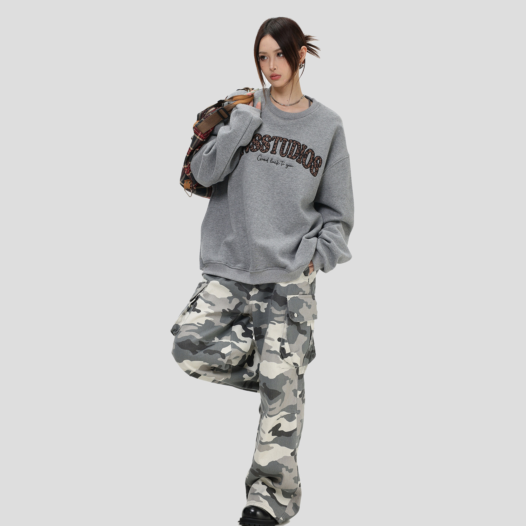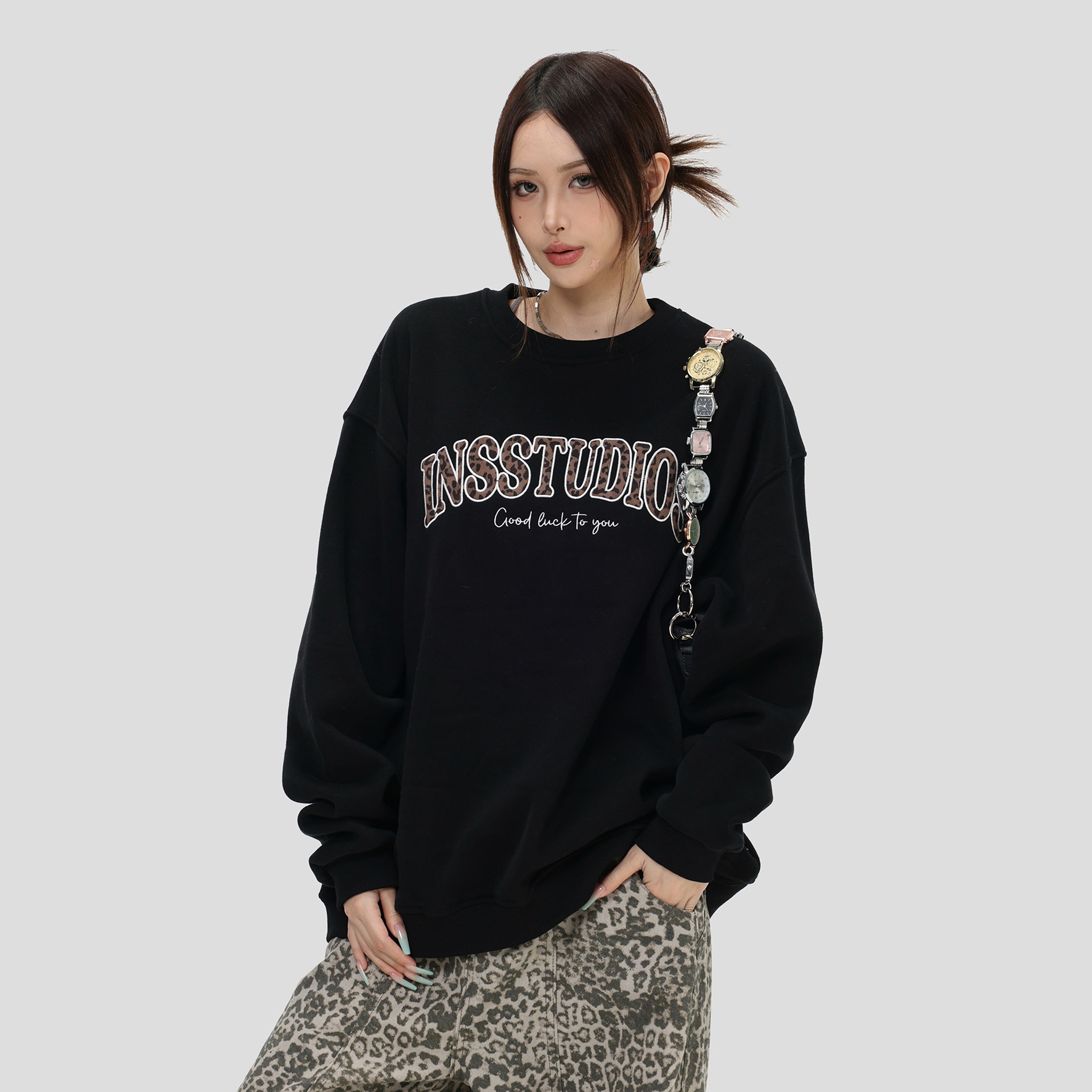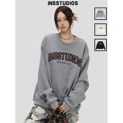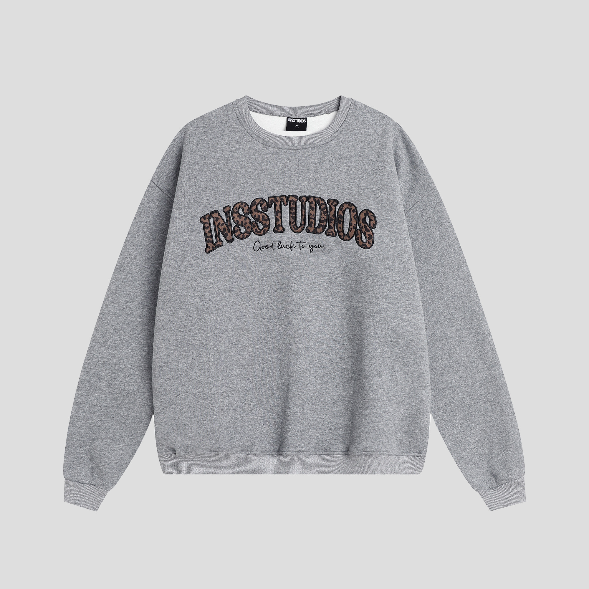INSstudios 国潮美式复古「豹纹刺绣灰色圆领卫衣」宽松加绒上衣