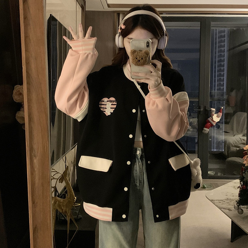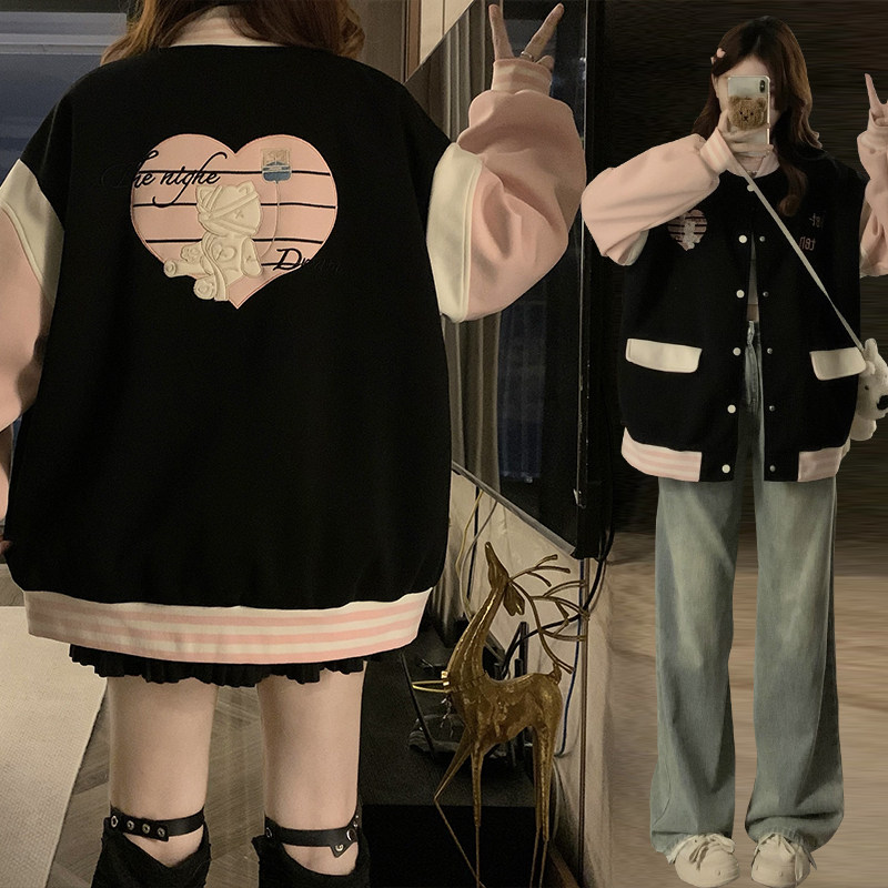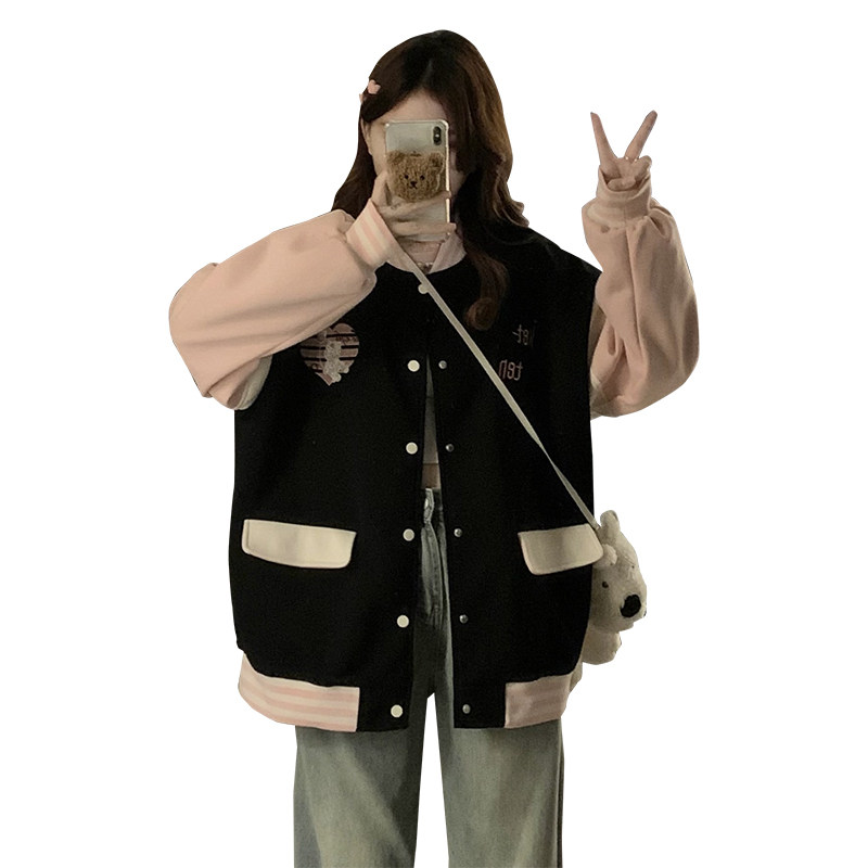 甜美学院风棒球服外套女2025年春秋新款宽松爱心刺绣百搭夹克上衣