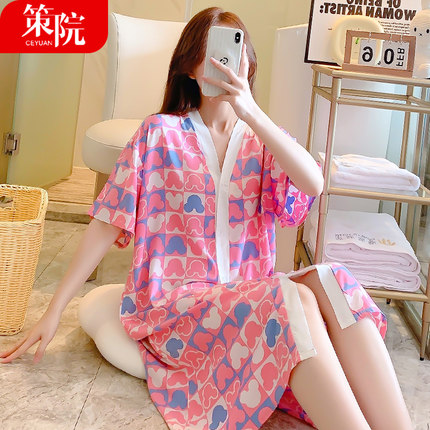 夏季女士棉绸睡衣韩版宽松人造棉布睡裙开衫绵绸连衣裙家居服短袖
