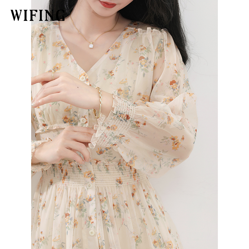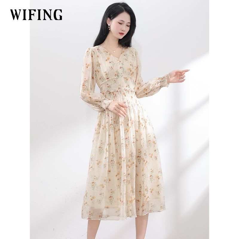 未风杏色雪纺碎花连衣裙女秋2025年秋季新款气质法式显瘦长袖裙子