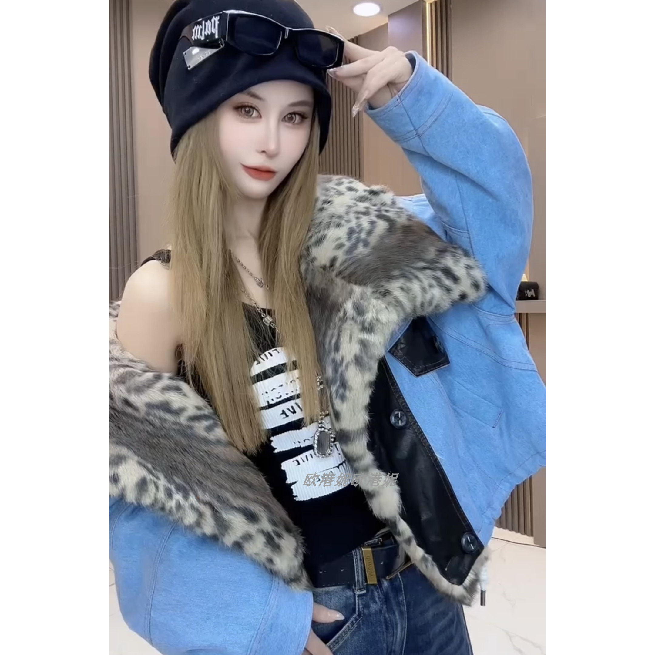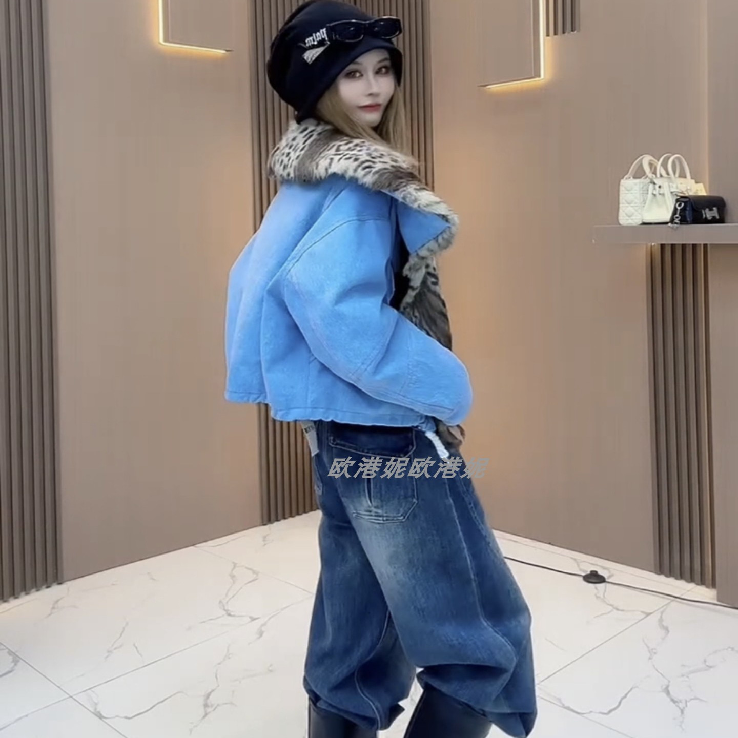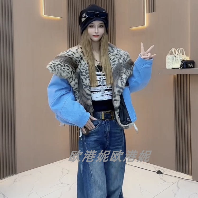 欧货冬季新款真兔毛豹纹毛领女短款牛仔羽绒服外套宽松保暖小个子