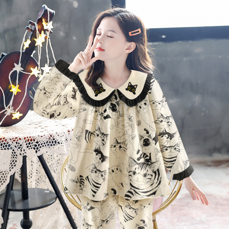 女童春秋季卡通猫咪纯棉新款长袖长裤可爱睡衣女家居服可外穿套装