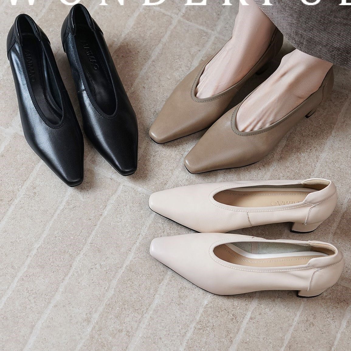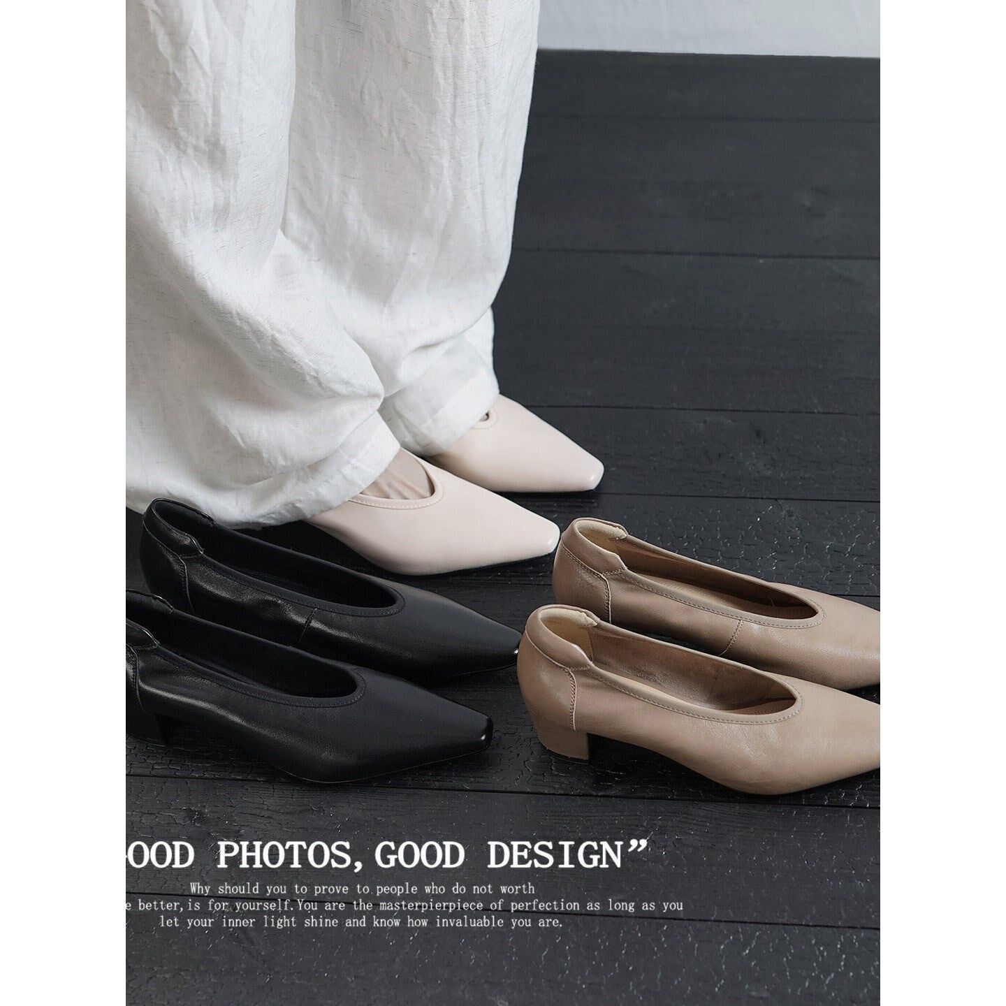 法式奶奶鞋全真皮软羊皮方头浅口单鞋粗跟中跟真皮一脚蹬百搭女鞋