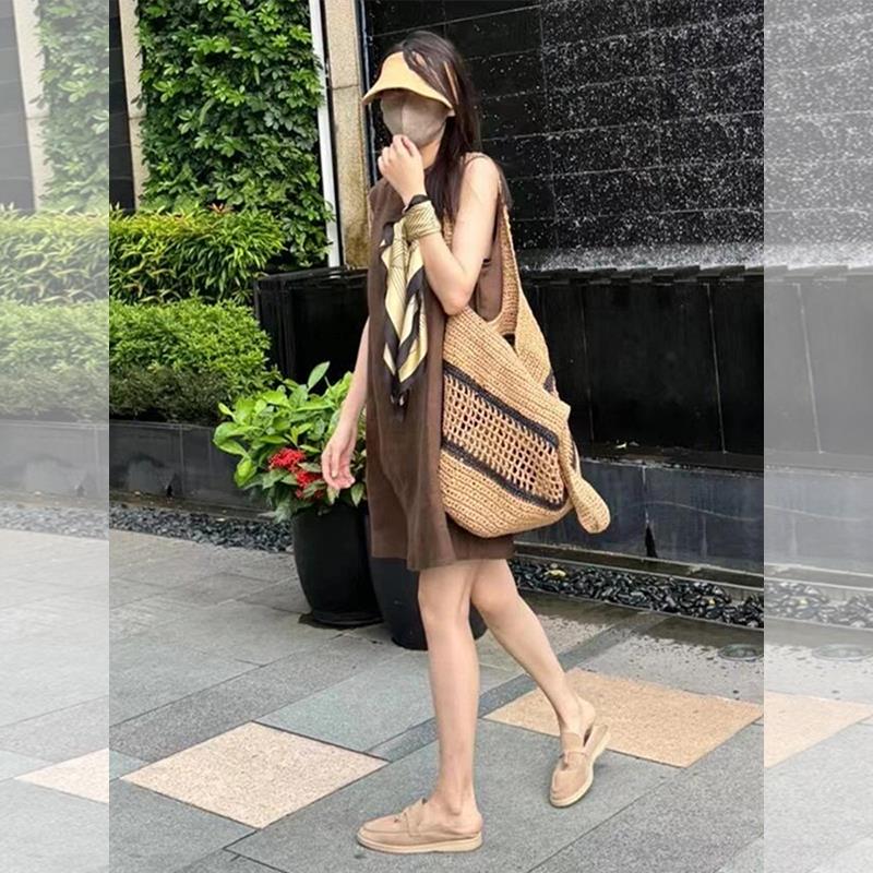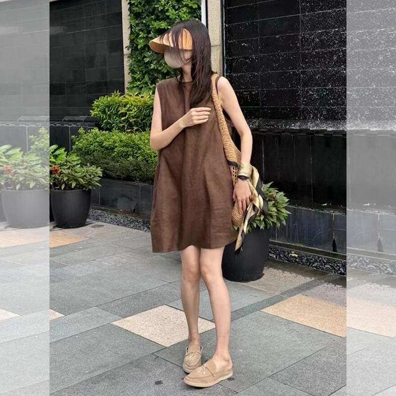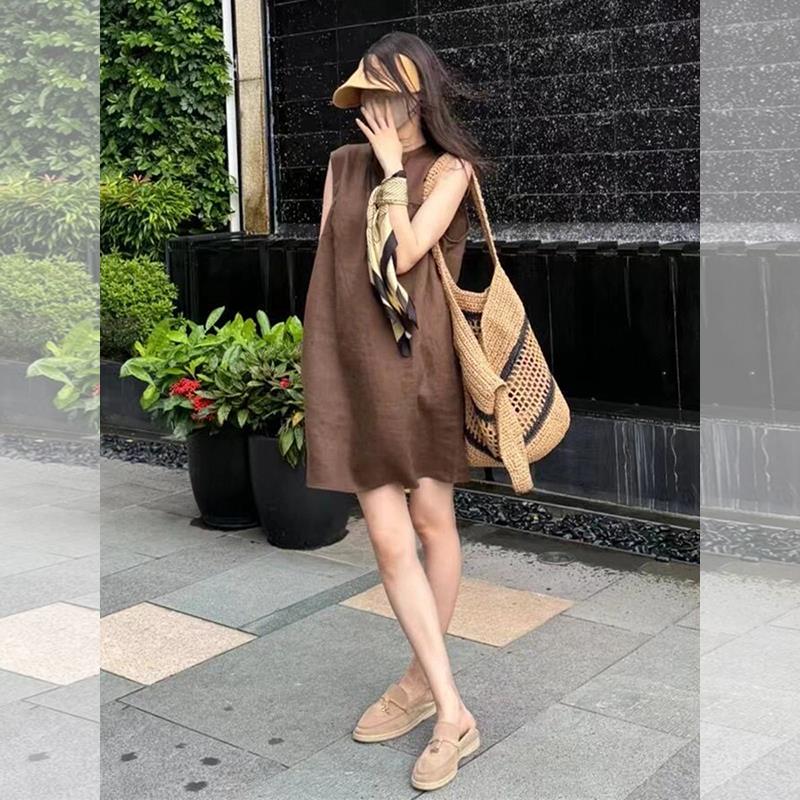 CHAO级推荐!棕色无袖亚麻背心连衣裙女夏季松弛感宽松直筒短裙子