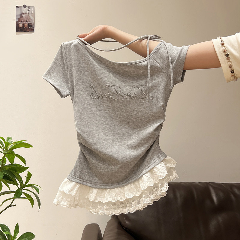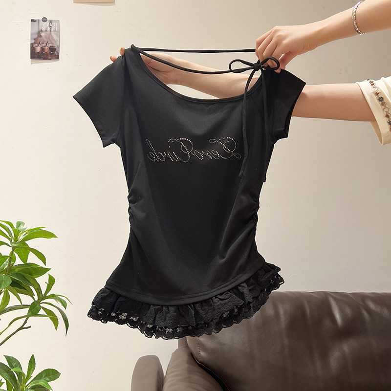 新款韩系2025斜肩蕾丝短袖夏季修身花边显瘦纯欲T恤上衣拼接镶钻