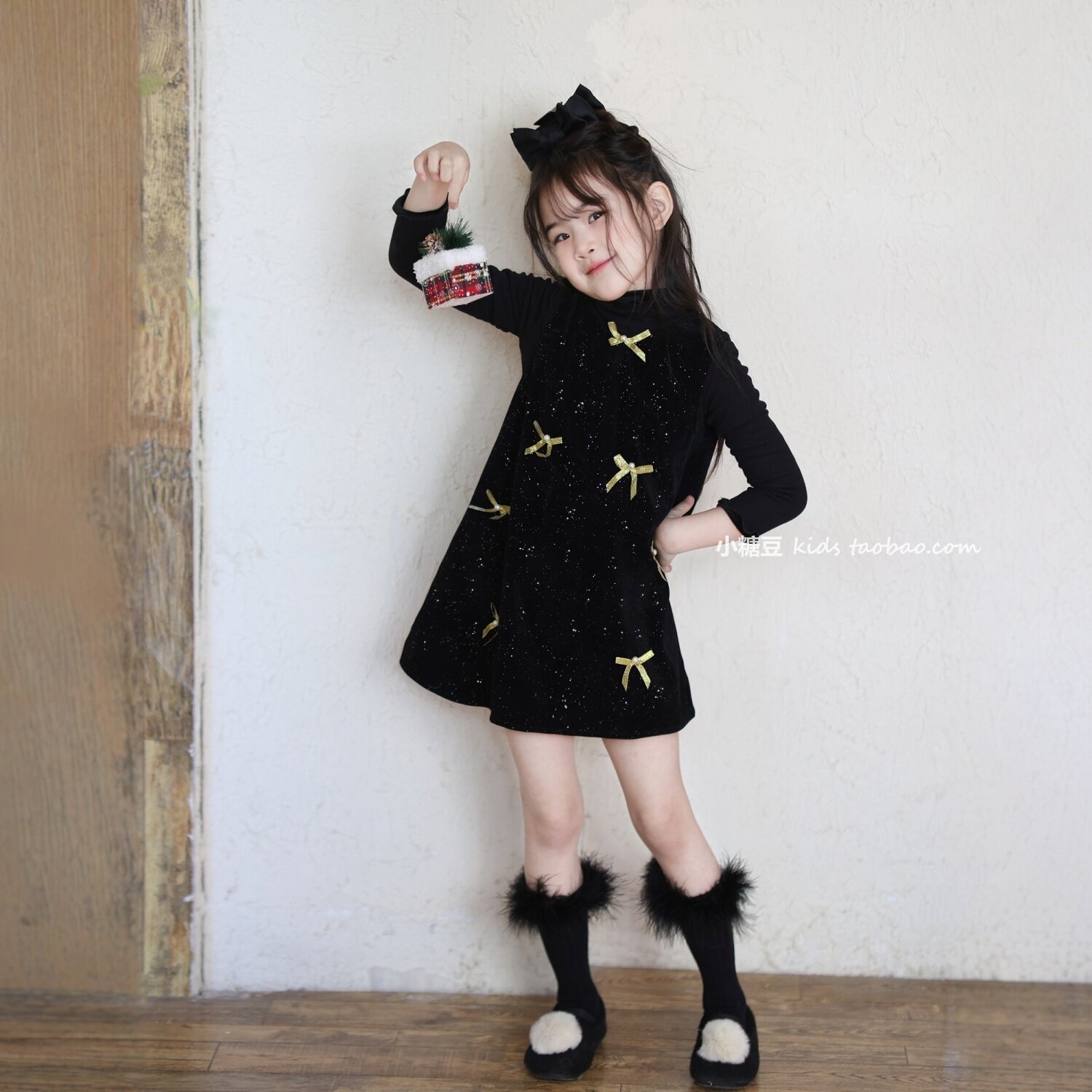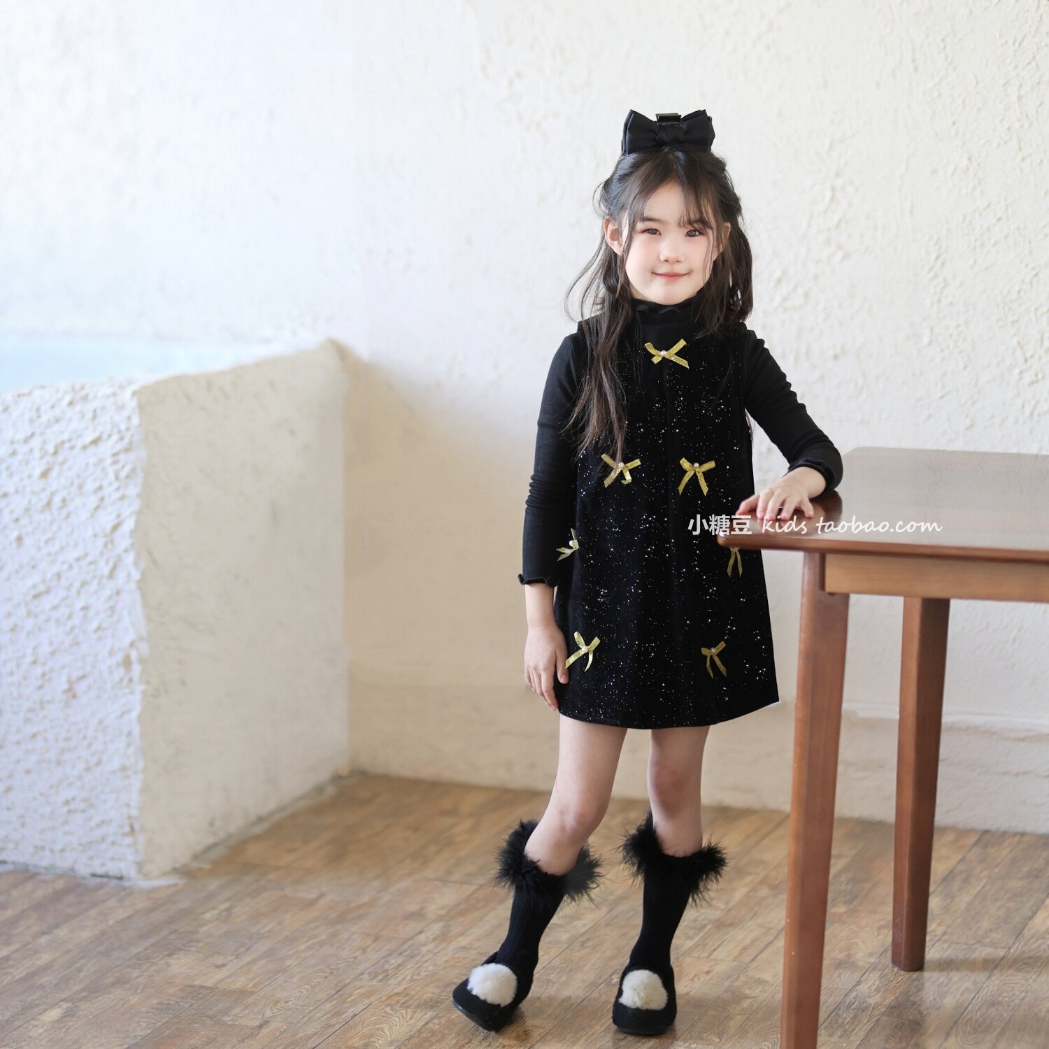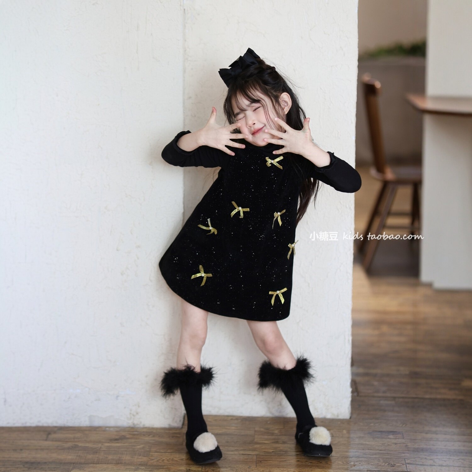 女童黑色闪闪丝绒蝴蝶结连衣裙