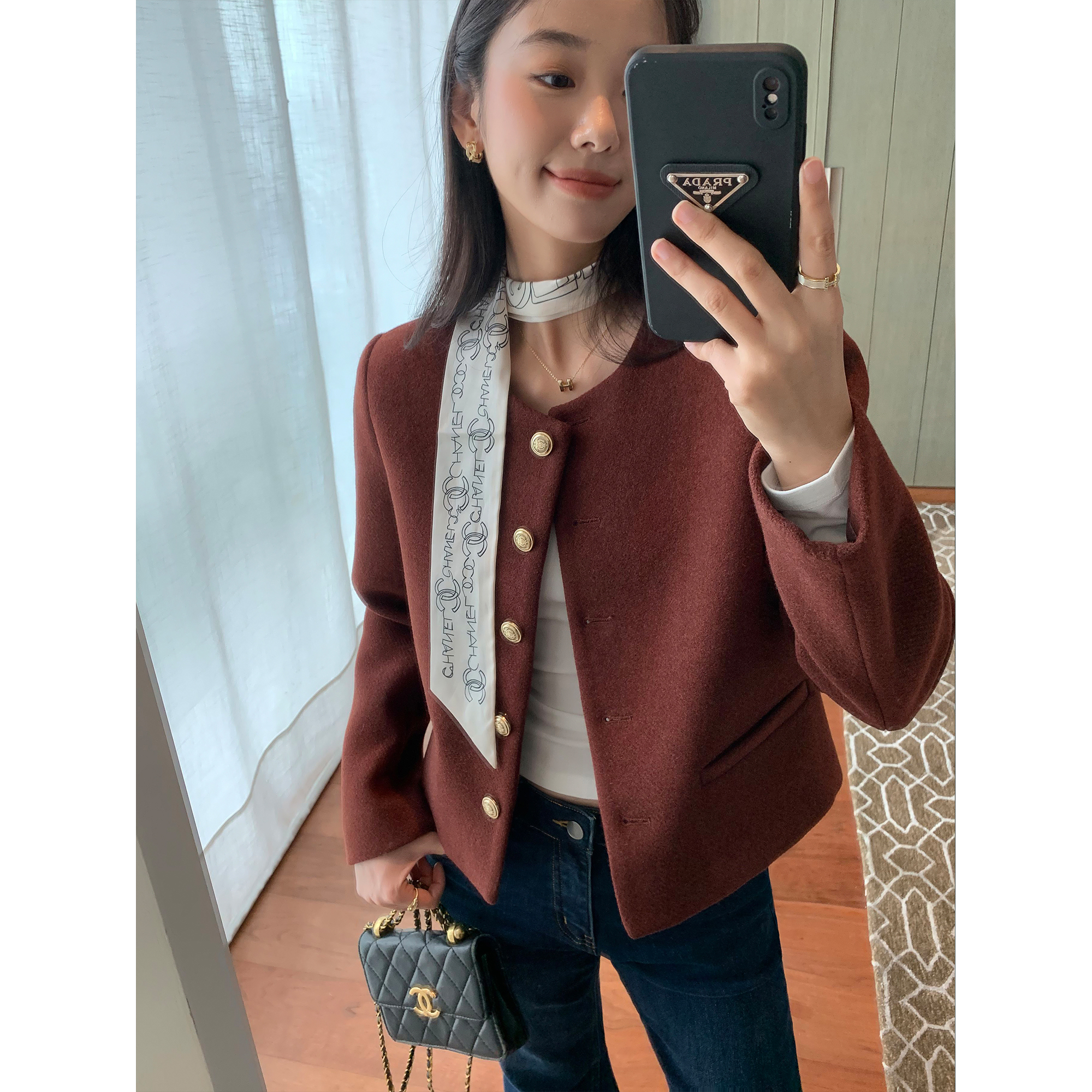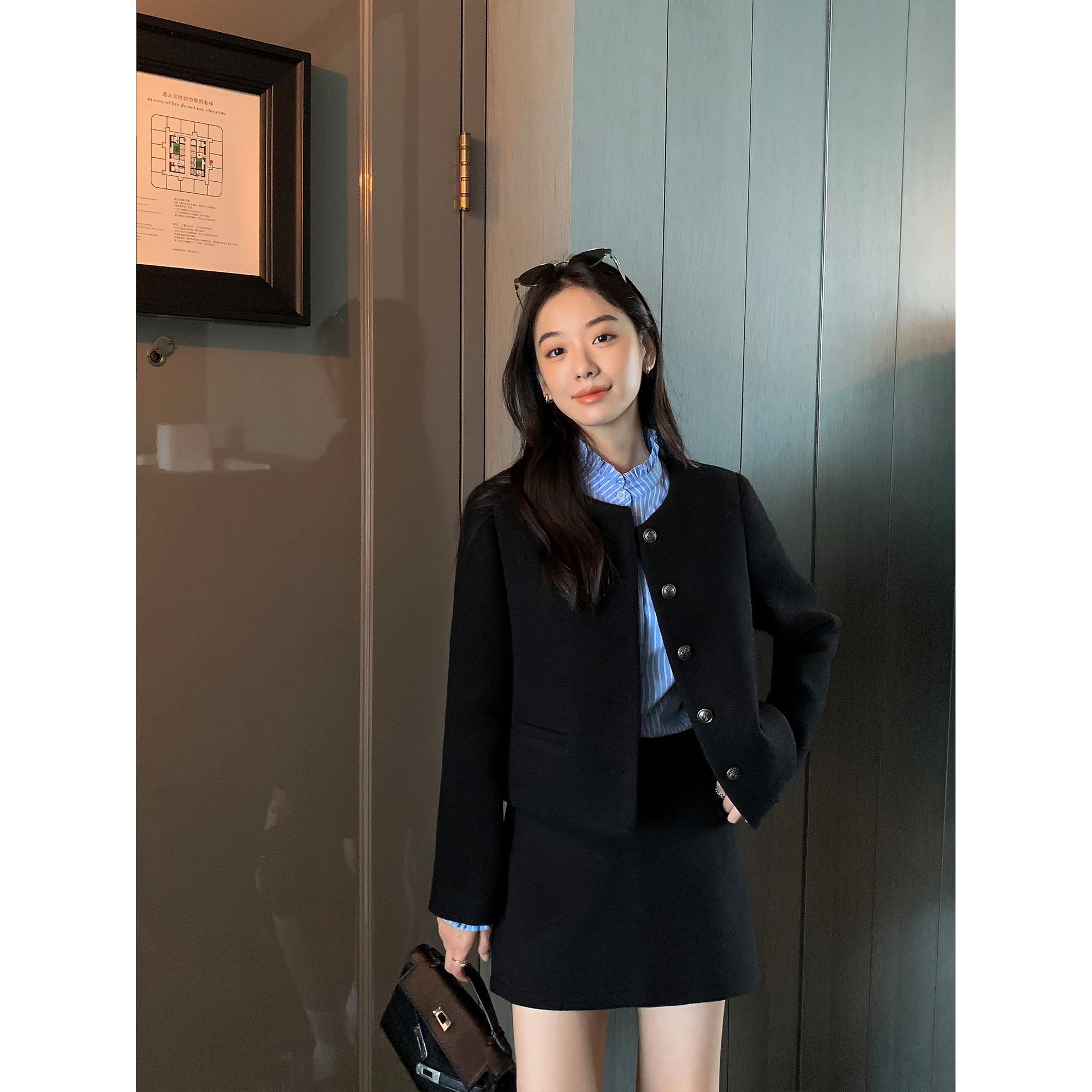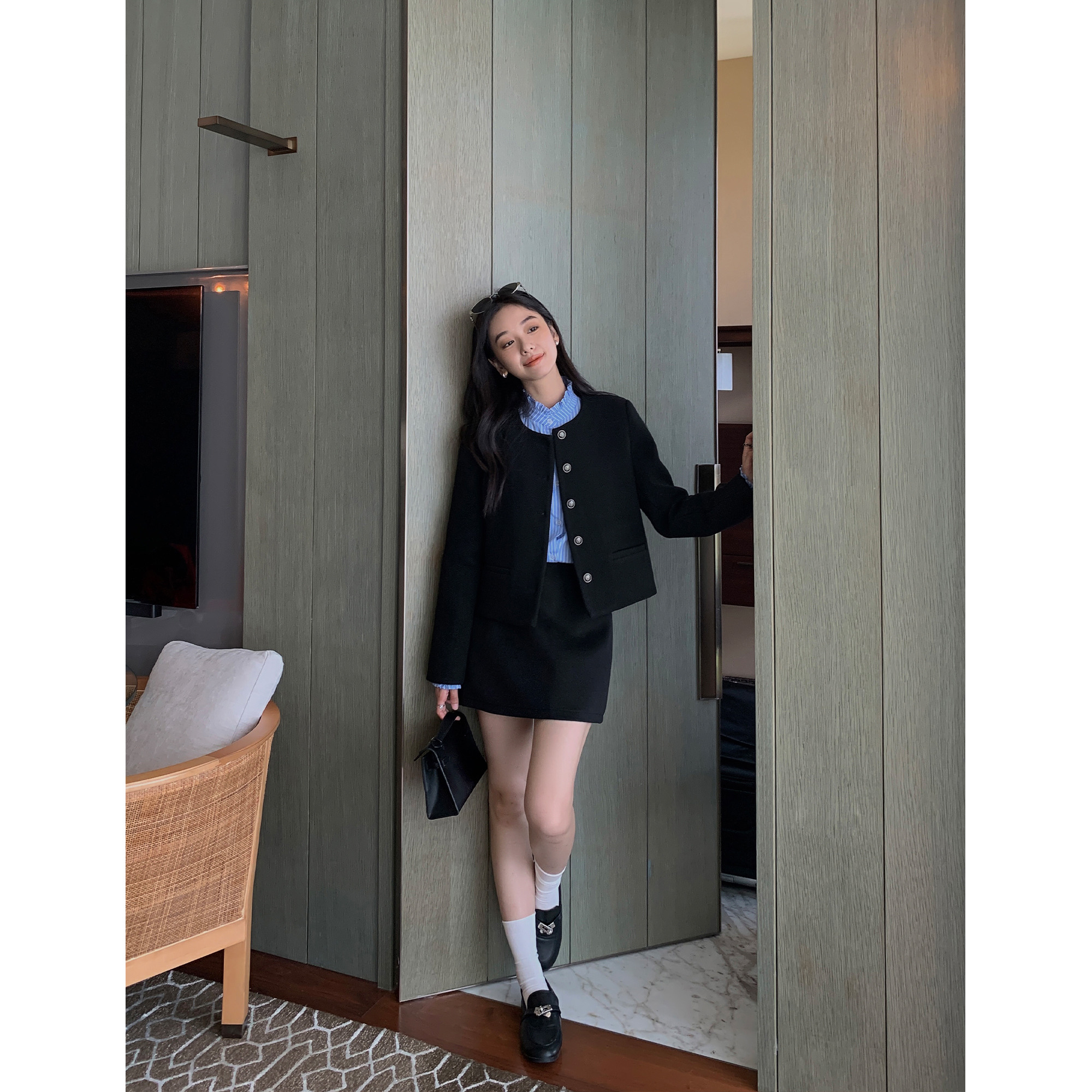 MULVAN 南山塔邂逅 黑色小香风毛呢外套女秋冬高级感气质短款上衣