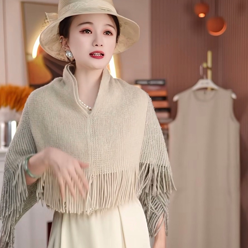 秋冬新款百搭针织流苏纯色披肩外搭开衫时尚气质保暖多功能围巾