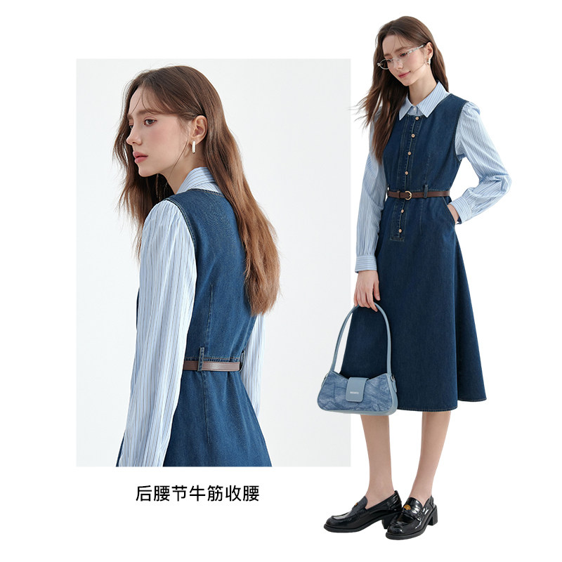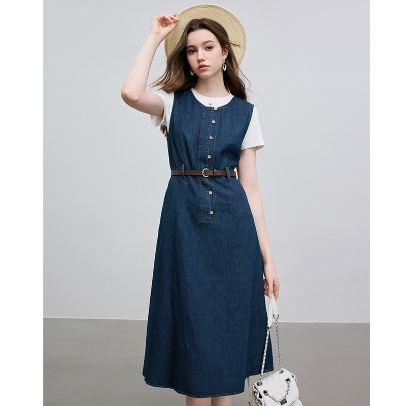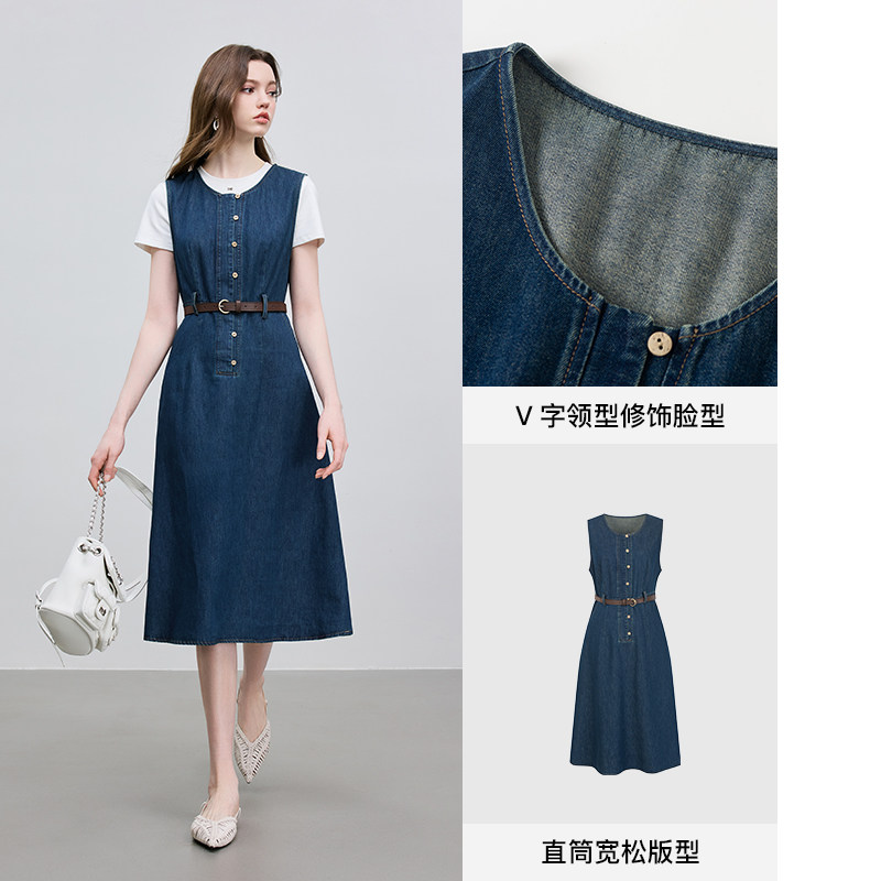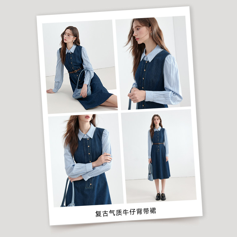 KBNE牛仔背带裙女复古裙子气质新款学院风深蓝色竖排扣a字连衣裙