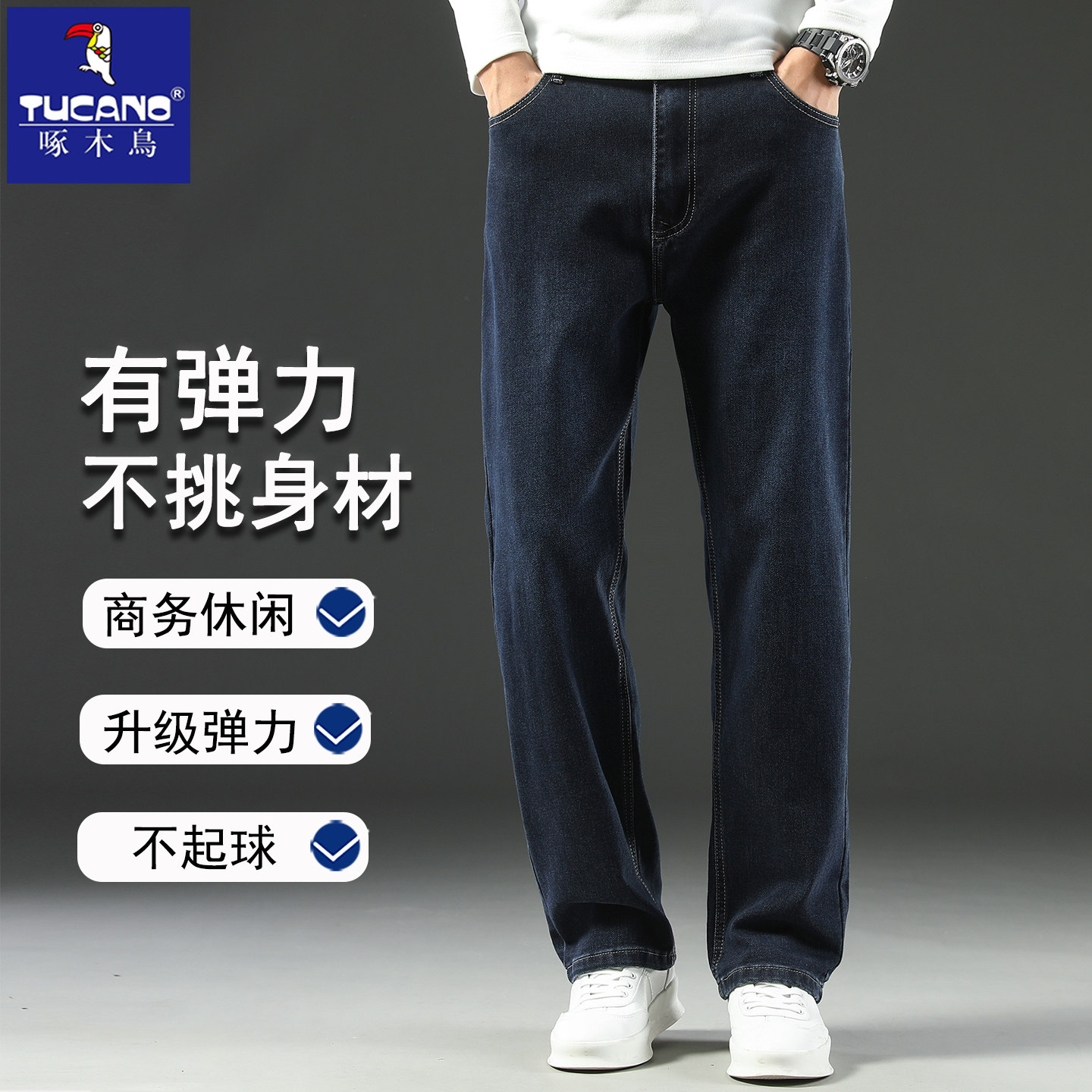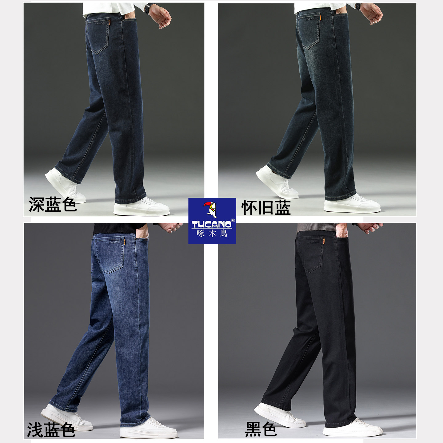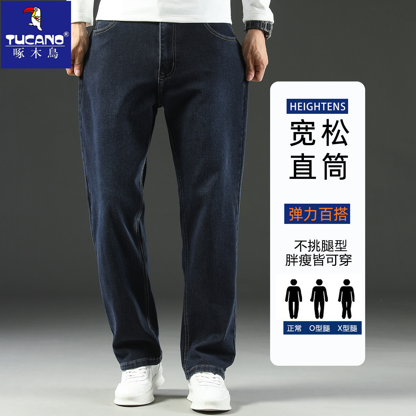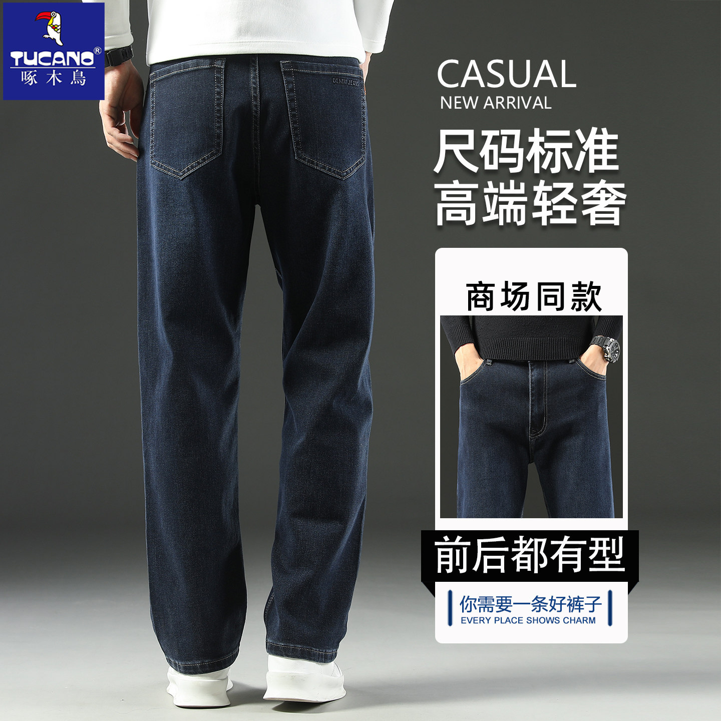 啄木鸟牛仔裤男加绒保暖宽松直筒中年百搭商务休闲弹力高腰长裤子