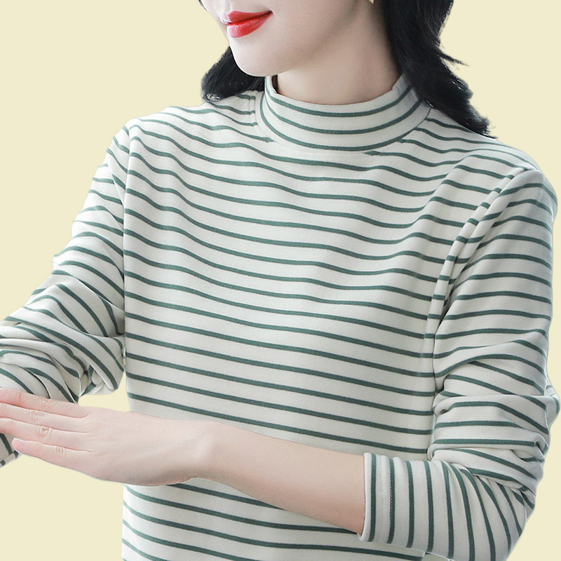 冬季新款2025半高领打底衫大码宽松条纹长袖t恤女士秋衣保暖上衣