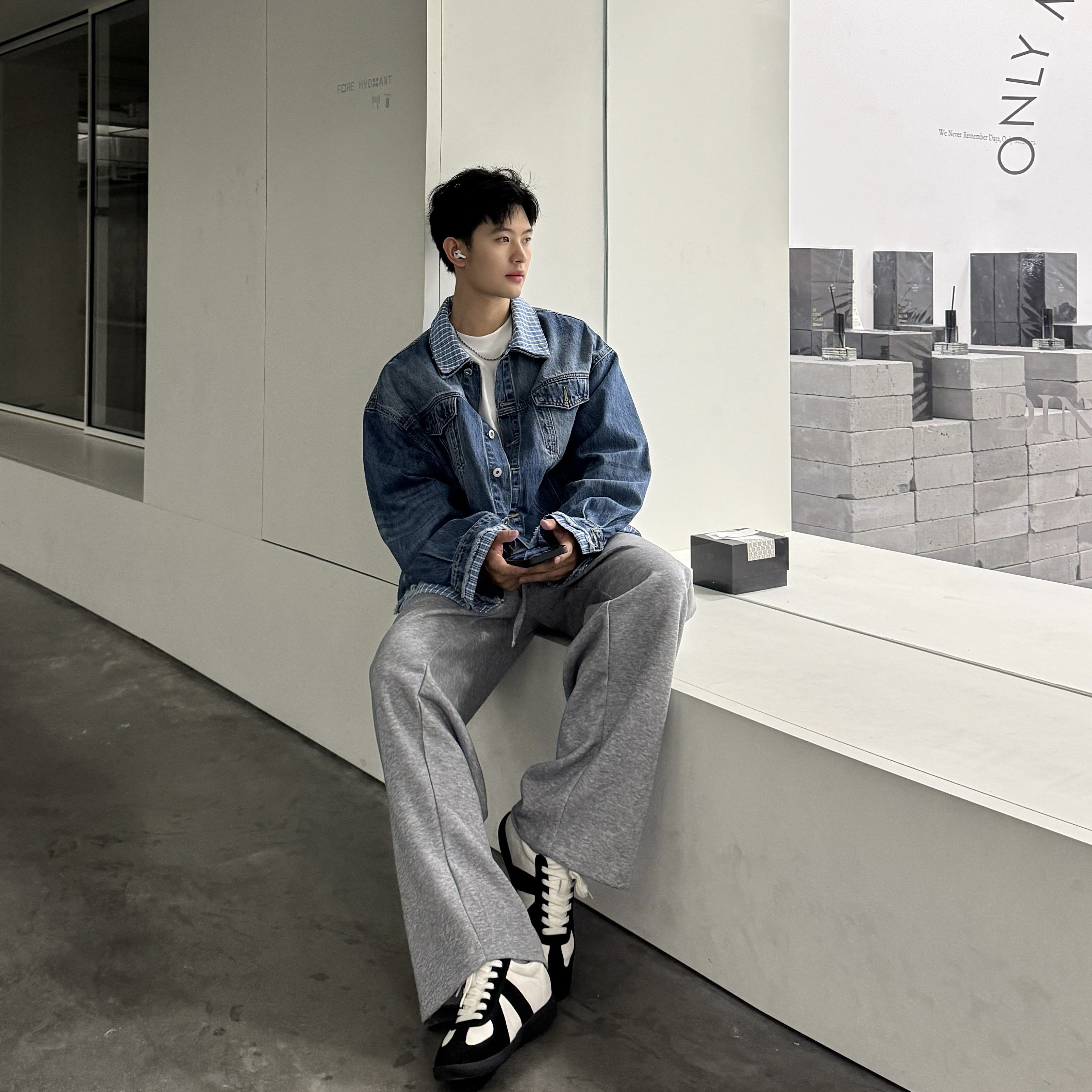 飞型记格纹拼接假两件牛仔外套男女潮牌街头设计感水洗复古夹克