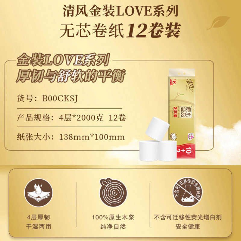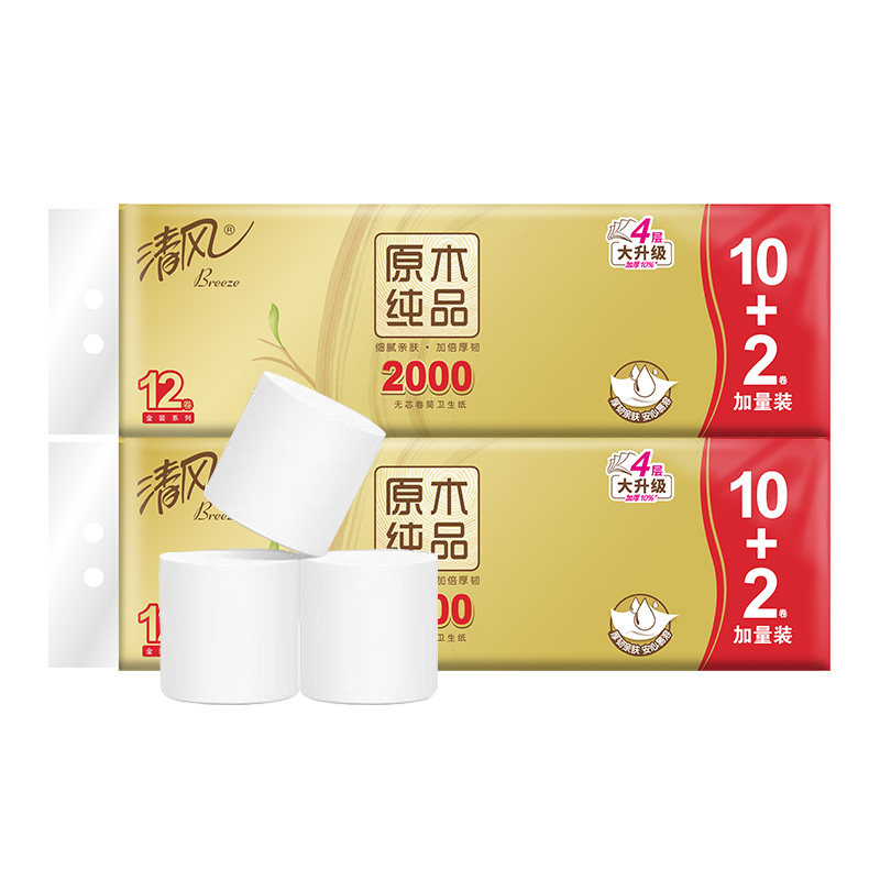 清风卫生纸2000克厕纸手纸原木金装系列卷筒纸无芯厚韧实惠装家用