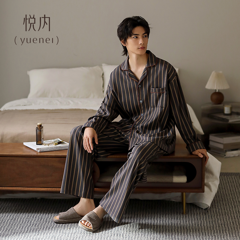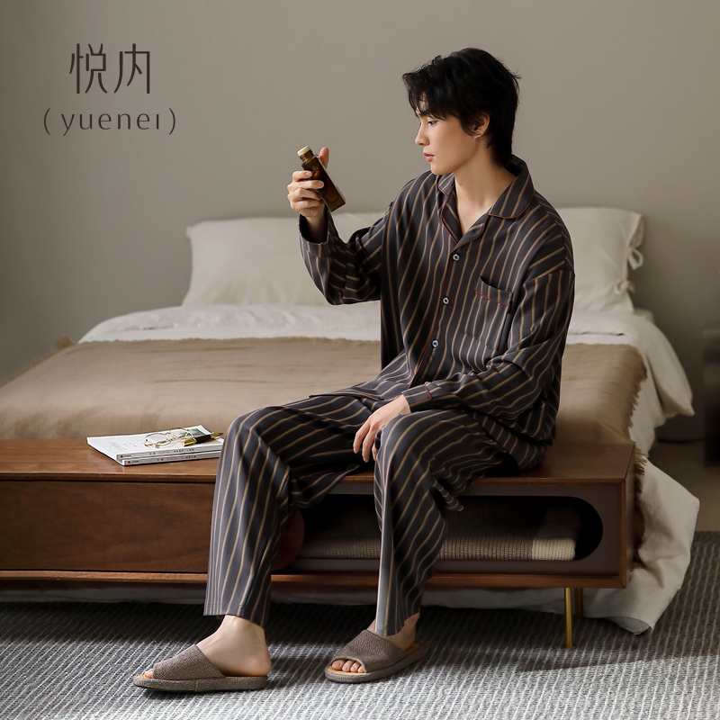 悦内睡衣男士春秋季秋冬款纯棉长袖家居服男款加大码四季通用条纹