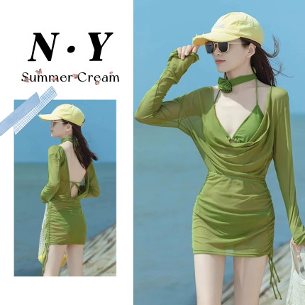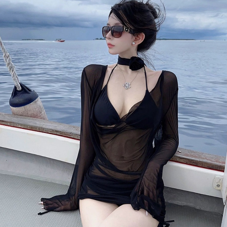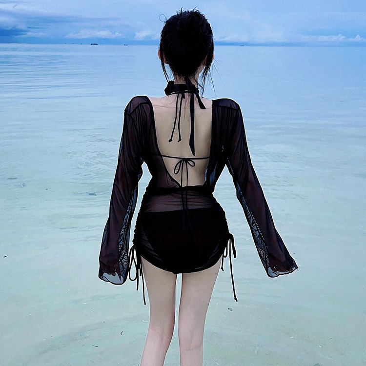 韩国ins性感辣妹聚拢显瘦长袖罩衫系绳吊带分体比基尼泳衣温泉女