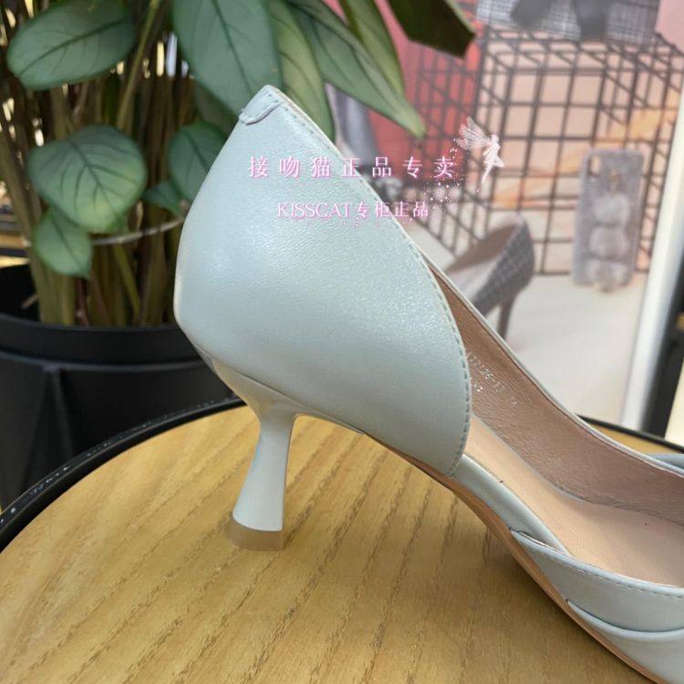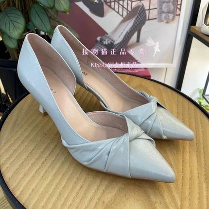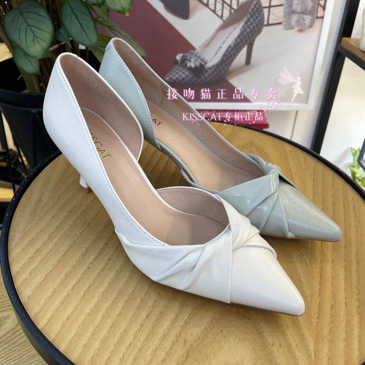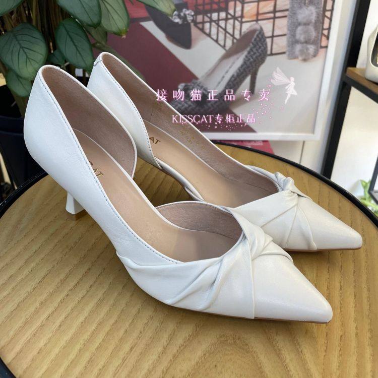 KISSCAT接吻猫2022春季新款优雅褶皱尖头细高跟女单鞋KA42126-13