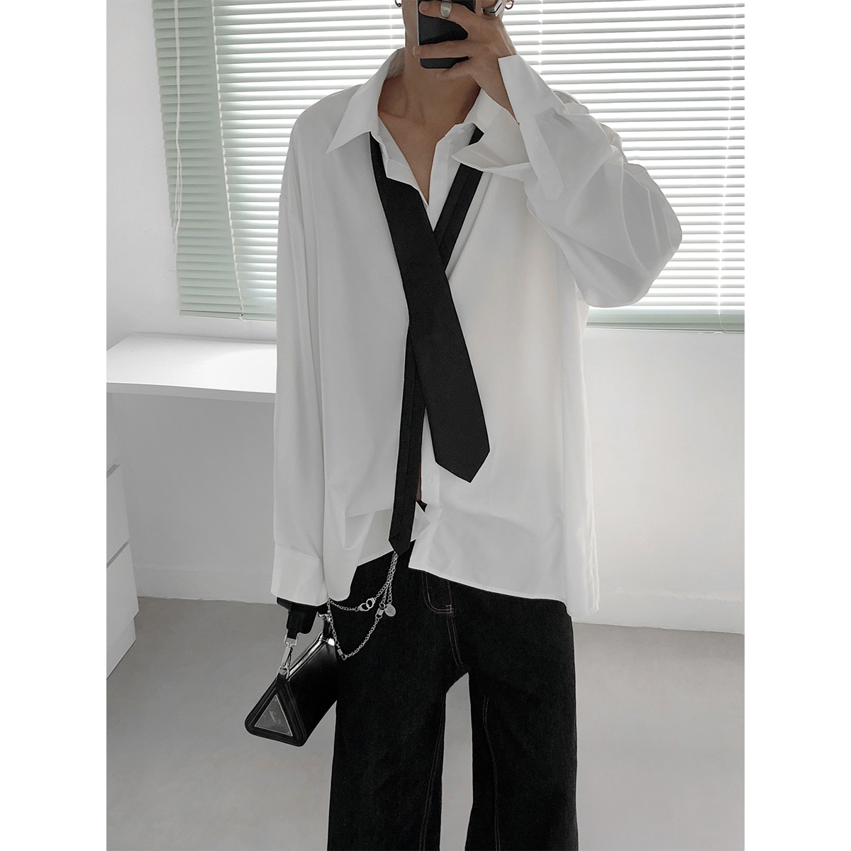 复得先生白色领带衬衫男高级感潮流宽松正装休闲衬衣新款长袖上衣