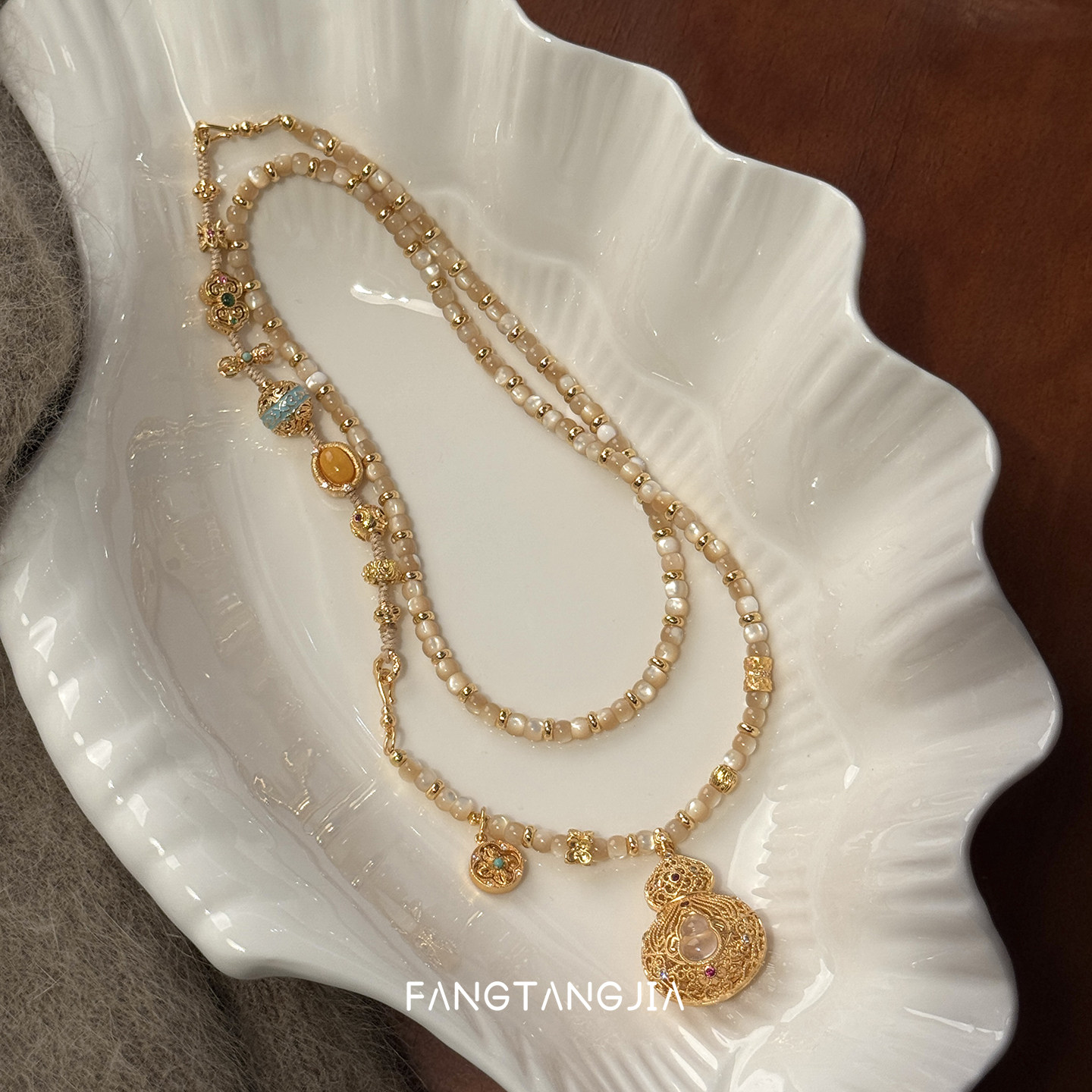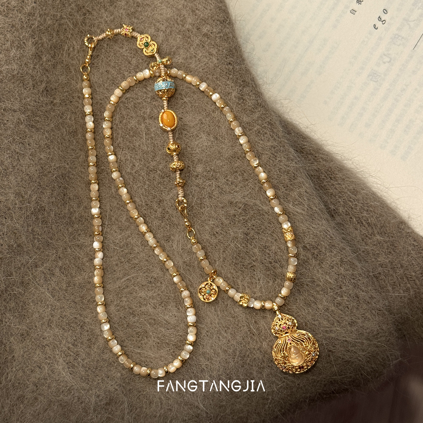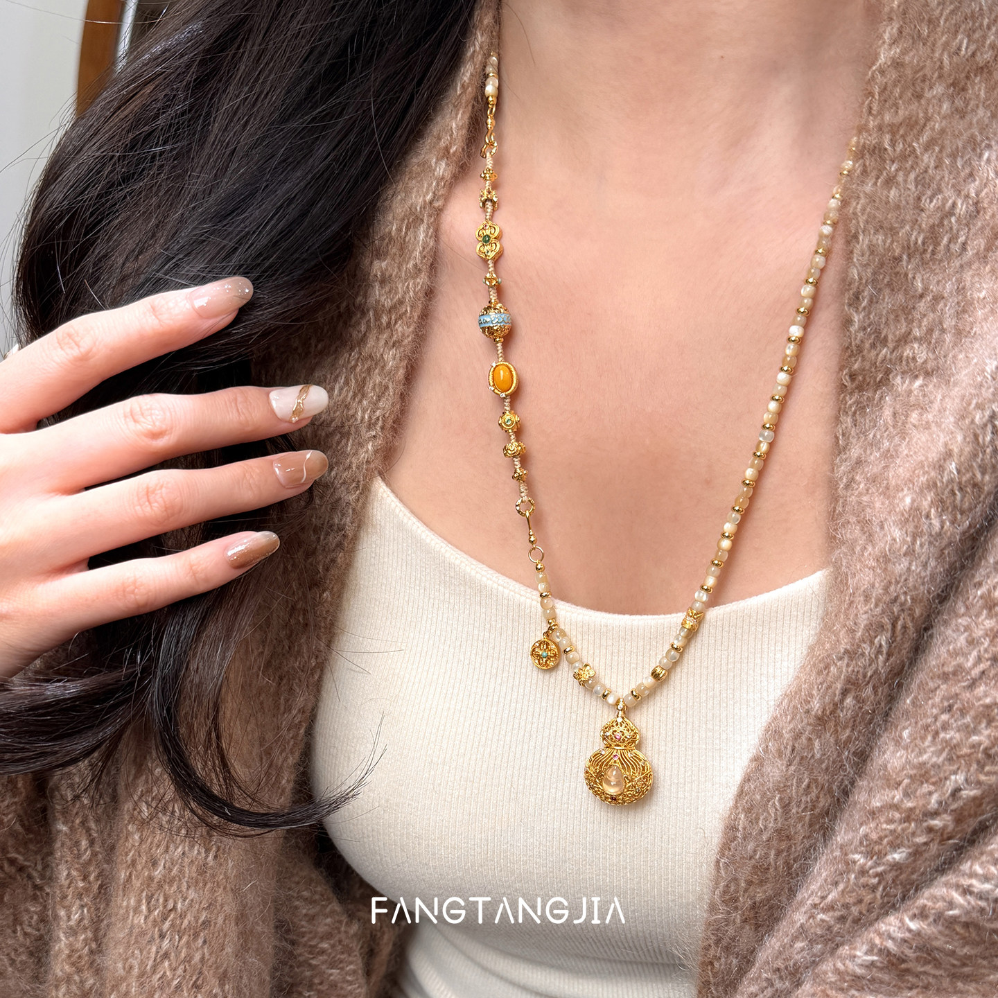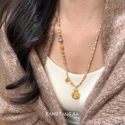 方糖家 原创多宝蜜蜡翡翠水沫玉古法葫芦项链新年高级感毛衣链女