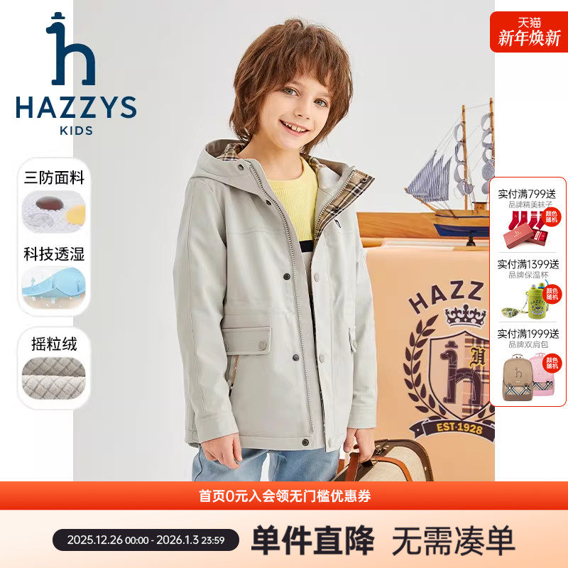 hazzys哈吉斯童装男女童风衣春季新品防护三防加绒连帽厚外套
