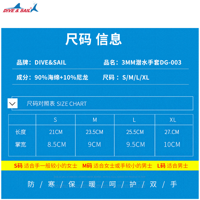 DIVE&SAIL潜水手套3mm专业防刺防割女保暖男防水母帆船冲浪超薄款