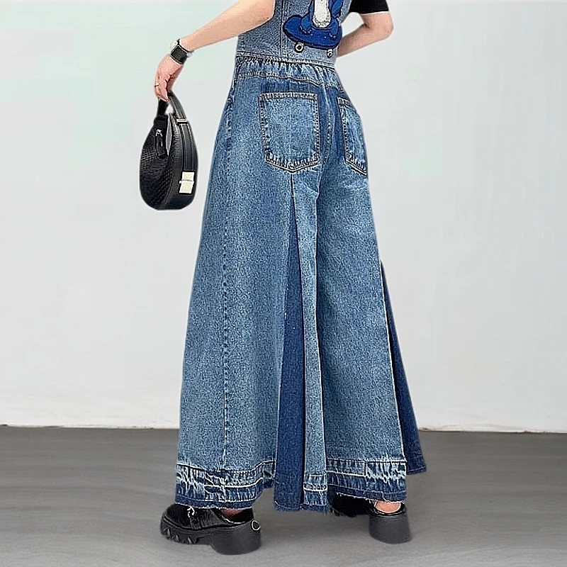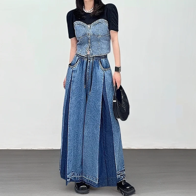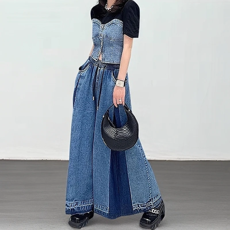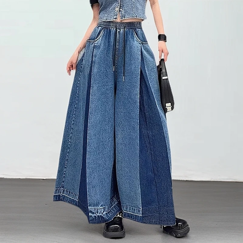 春季2025新款今年流行爆款休闲拼色牛仔阔腿裤女松紧腰系带九分裤